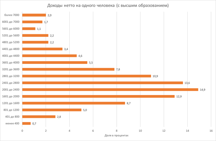 Если брать только людей с высшим образованием, то медианный нетто доход среди них – 2541 евро в месяц.