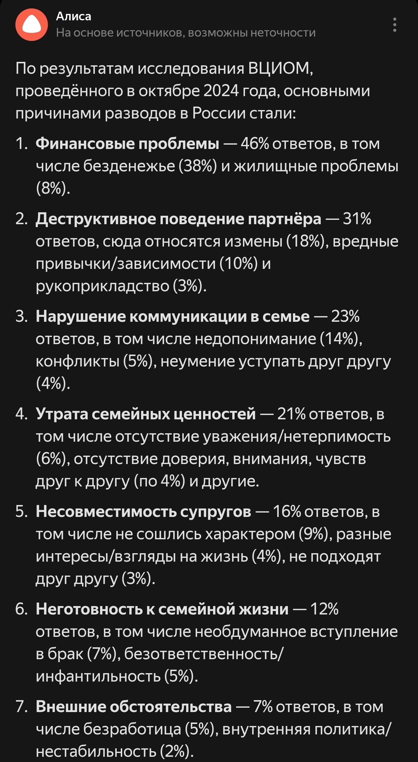 Но проценты я бы сократил вдвое. Наверняка половину просто оговорили и накаких измен, насилия и алкоголизма там и в помине не было.