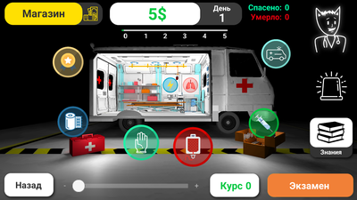 Чтобы управляться со всем этим в игре есть теория, которая разделена на курсы. После каждого курса, даже нужно сдавать небольшой экзамен, чтобы выехать к пациенту.