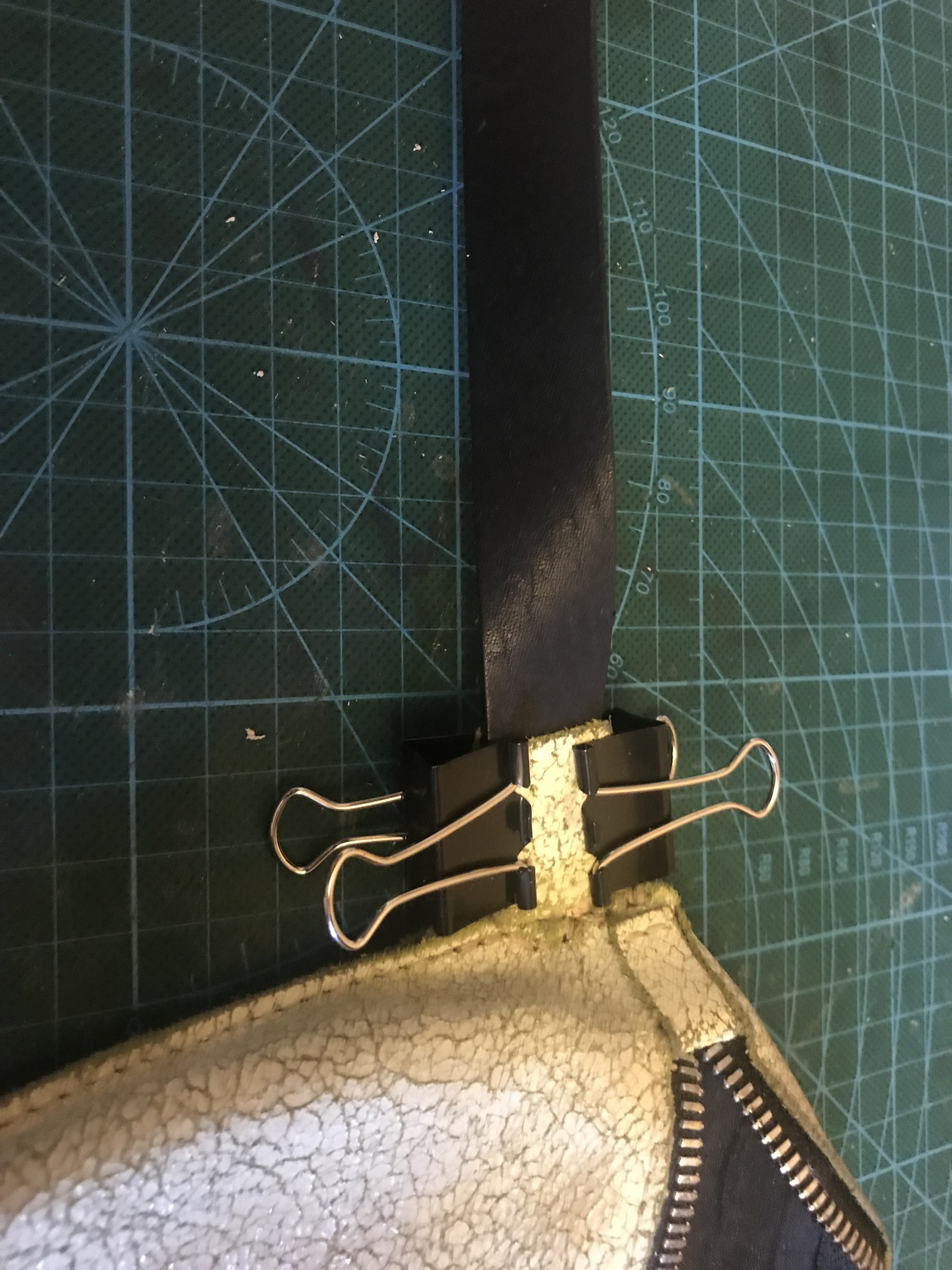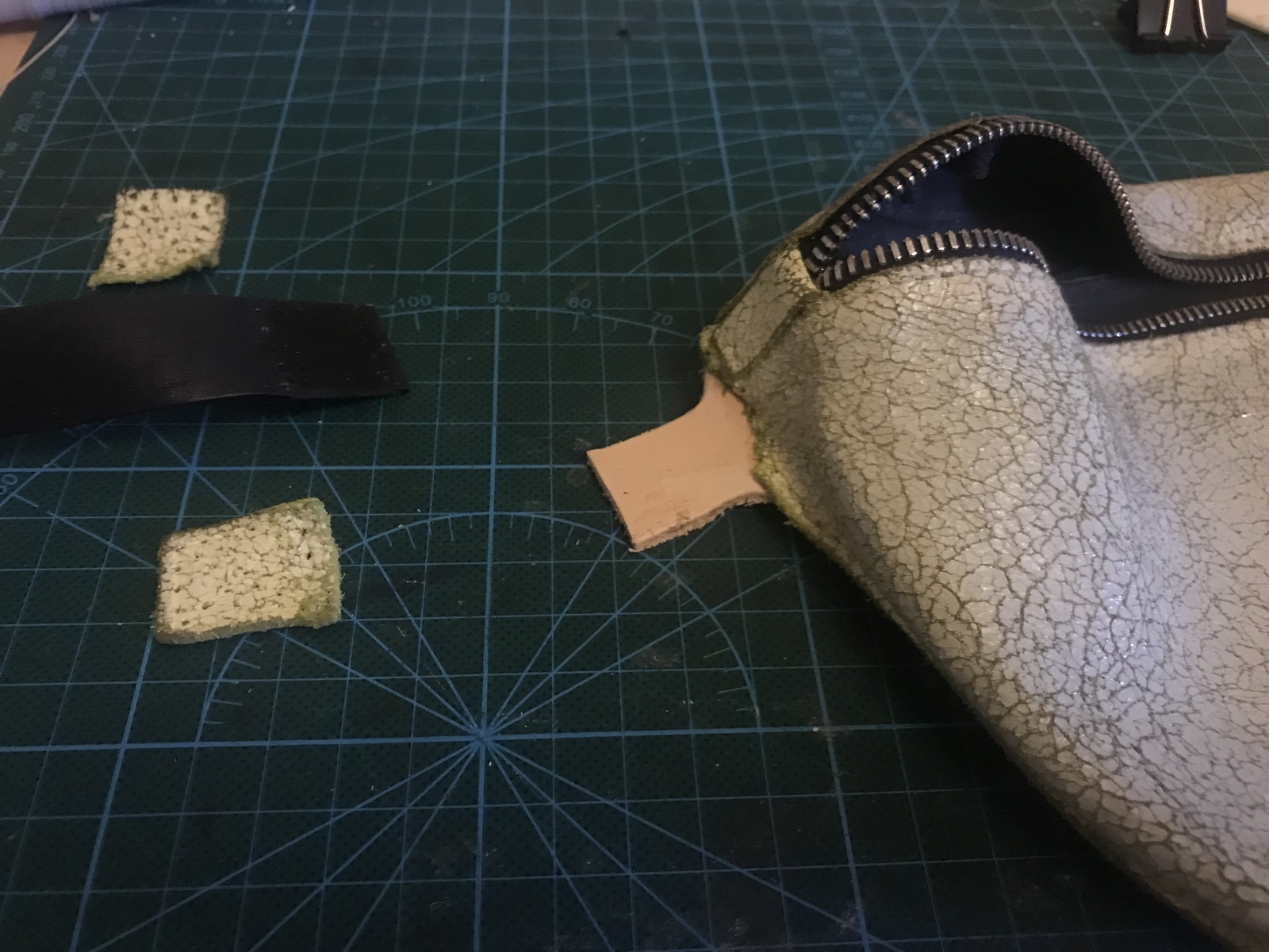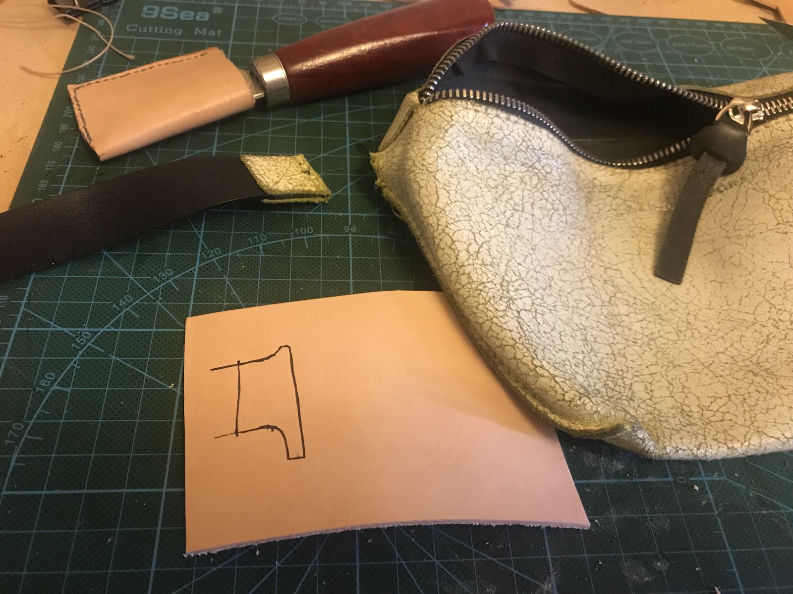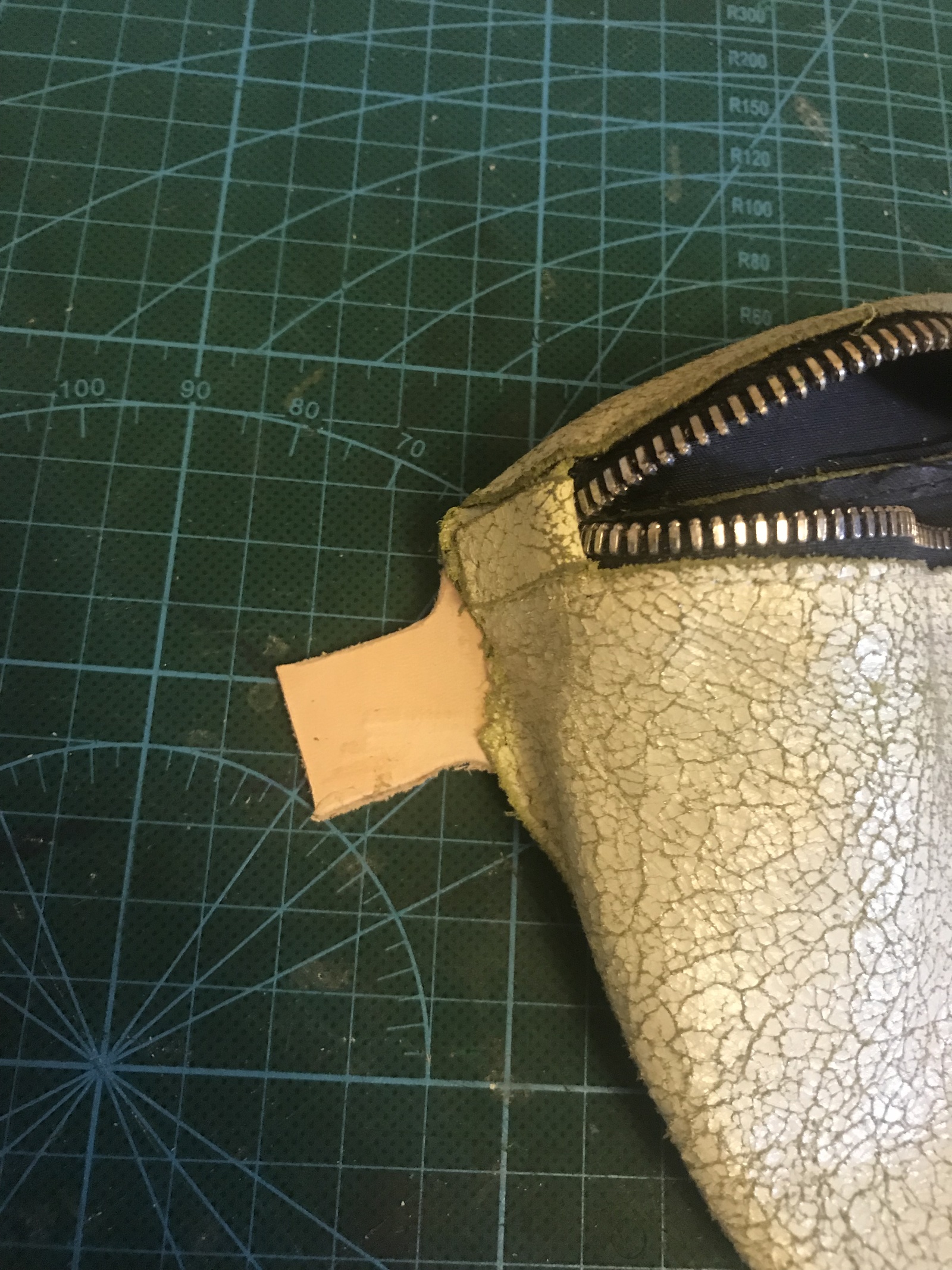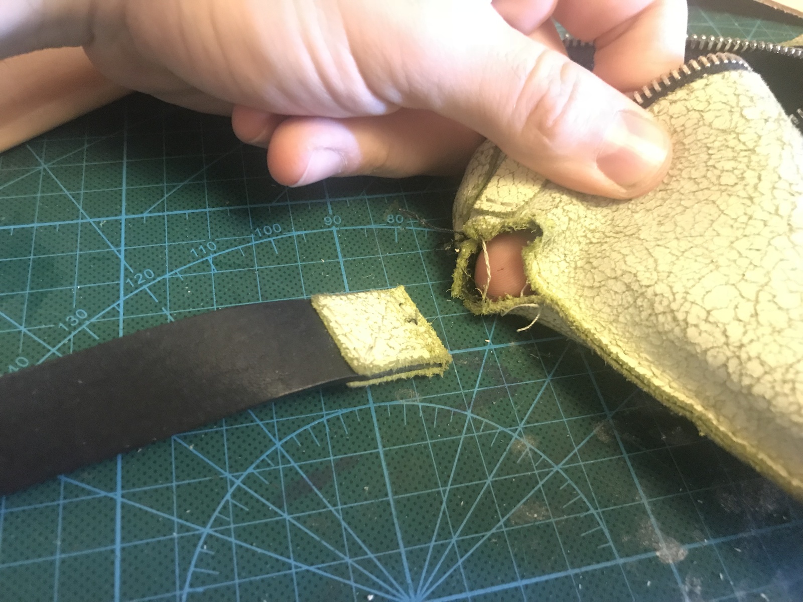 Дальше все понятно и логично . Сделал нужного размера кусочек , распарол ремень и немного шов на самой сумки . прошелся клеем и зашил.