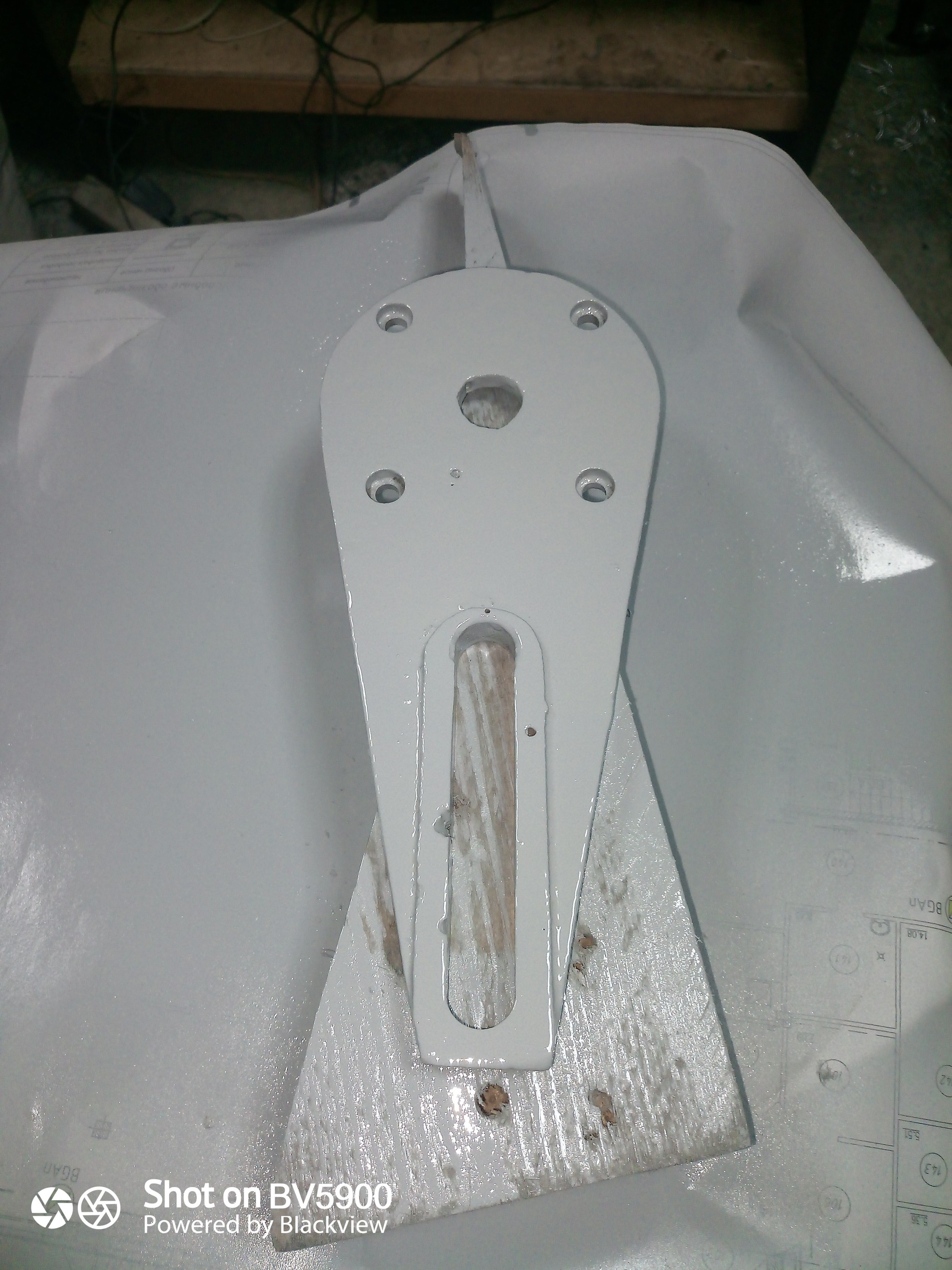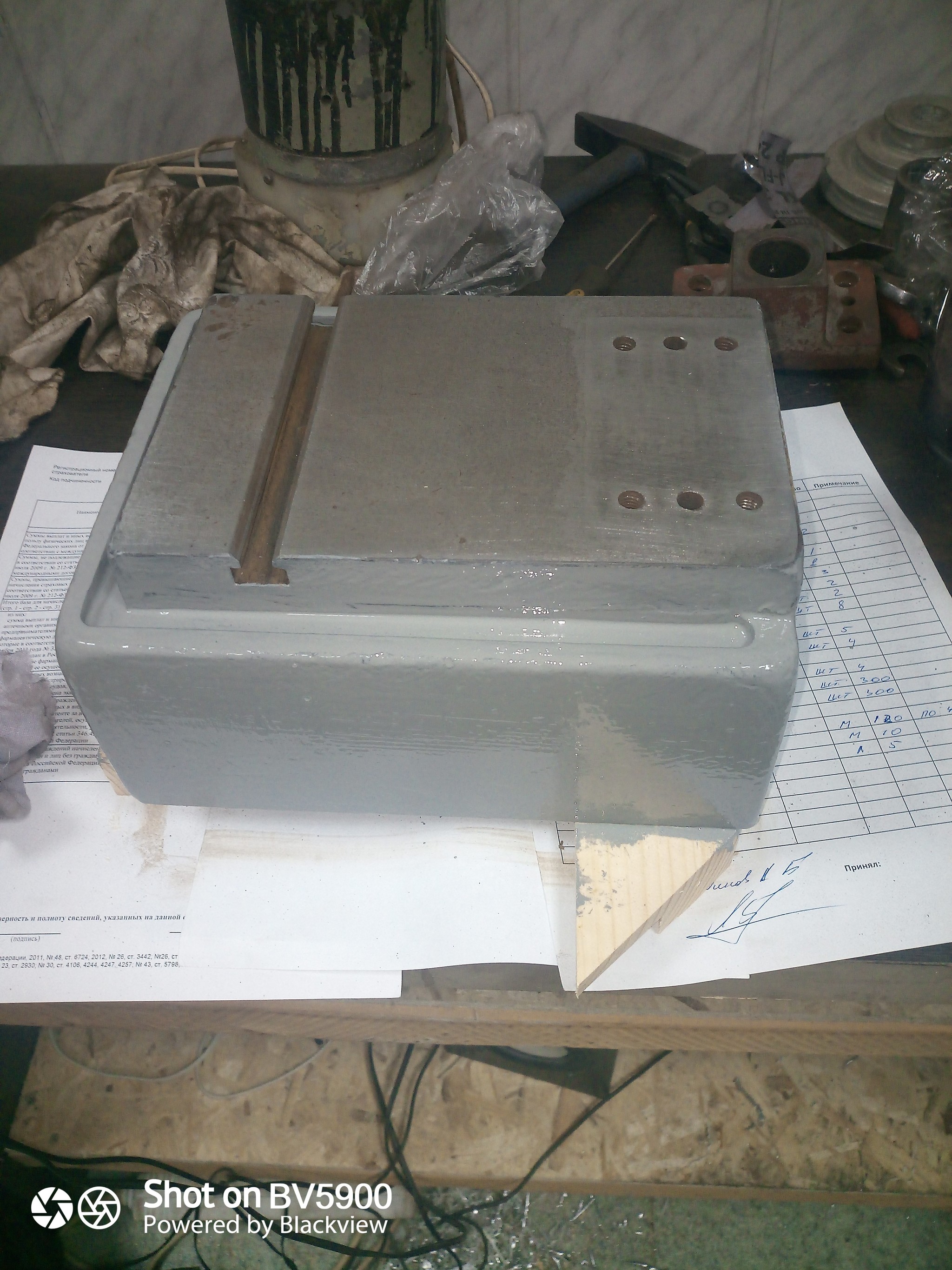 В отверстия вставил заглушки,чтобы не попал грунт,большие отверстия обходил осторожно кистью. При окраске поставлю тоже заглушки ,чтобы краска не попала. Ну и после того,как грунт хорошо просох,стал красить. Грунт при высыхании дал темный оттенок,а эмаль легла светлее,что придает станку нейтральный ровный цвет.