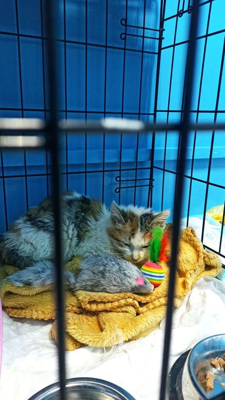 Спасли. Девочка, трехцветка, семьсот граммов урчания. Возраст – месяца два.