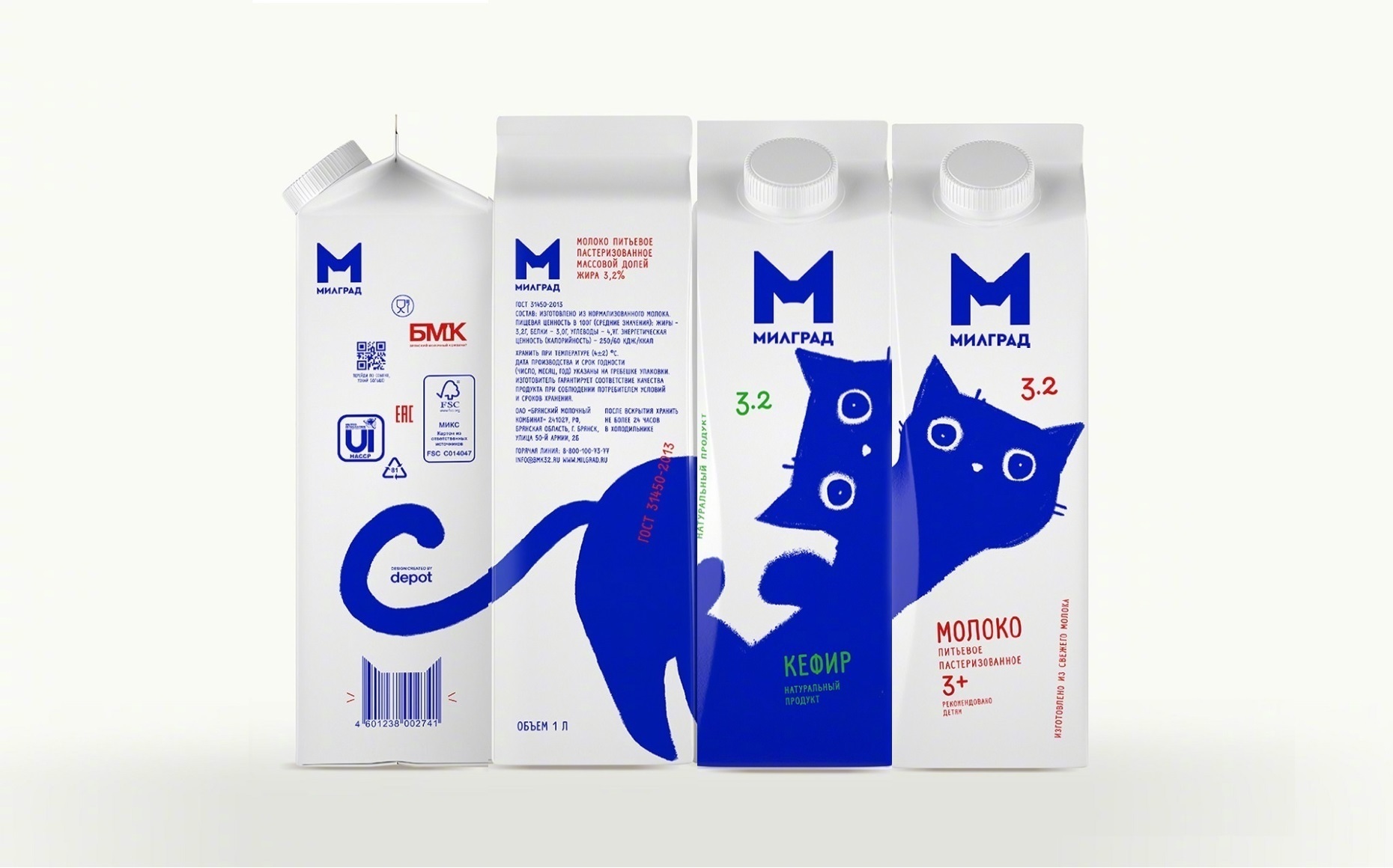 Мы оставили главное: синий цвет бренда и белый фон, больше ничего. Разработанная нами концепция упаковки заключается в упрощении, чистоте и установлении эмоциональной связи с потребителем. В логотипе появился силуэт котика, который сильно любит молоко. Продукты в линейке отличаются цветом шрифта: красный цвет для молока, зеленый – кефир, а желтый для ряженки. Сам кот не стесняясь расположился на всех гранях упаковки и принимает различные позы в зависимости от продукта, вам предстоит выбрать свою любимую!