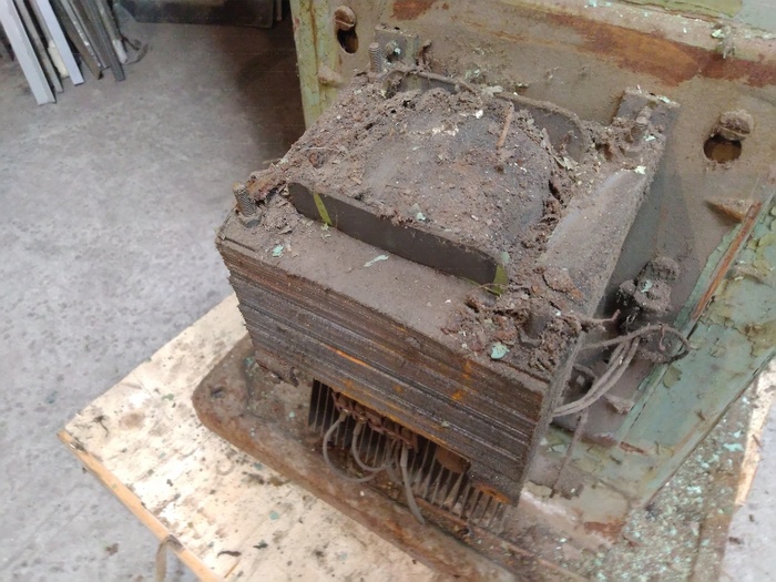 Трансформатор, питающий магнитную плиту был не любим. Зато его пиздили. Поэтому кожух ему помяли, а мас он мало того, что весь в говне и мусоре, так ещё и обвис передним краем чуть не на два сантиметра относительно заднего. Вообще, конструктору, придумавшему крепить защитный кожух не к массивному чугуну станины, а к трансформатору - надо забить в голову, ссука, лом.
