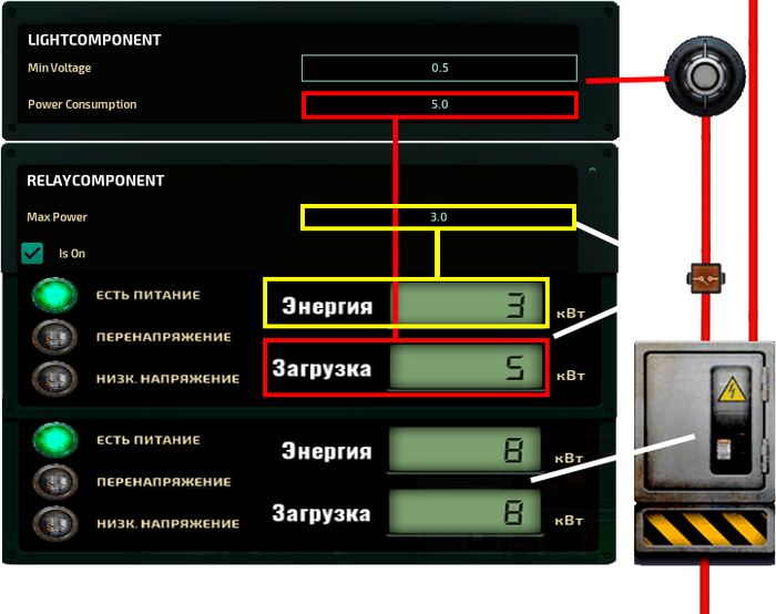 Подключенные друг к другу распределительные коробки имеют одинаковые значения загрузки и выработки. Только реле и батареи могут направлять энергию, изолируя части энергосистемы друг от друга.