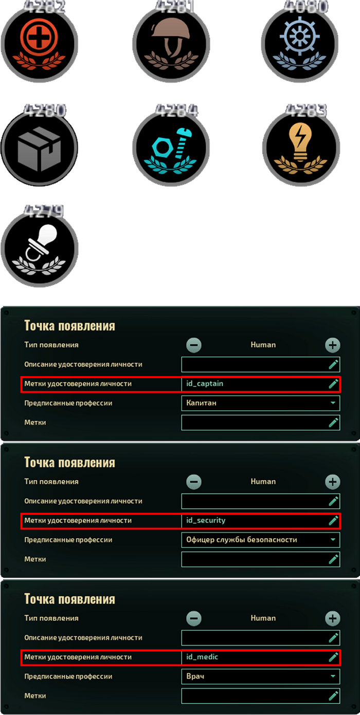 Любой профессии можно прописать свой «ID». Позже останется лишь вписать его нужной двери или стальному шкафу. Игрок, появившийся на спавнпоинте, получит карточку с нужным ID. Если этой карточкой завладеет иной игрок, у него также будет доступ, поэтому при гибели члена экипажа с особым доступом в первую очередь необходимо искать его карту.