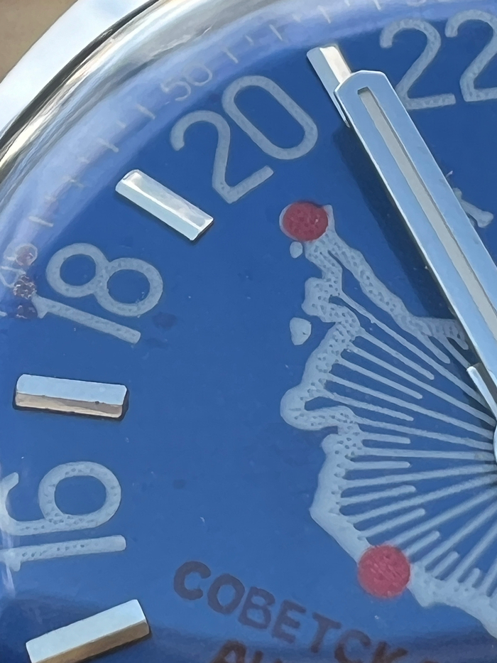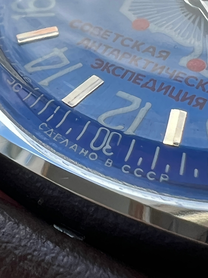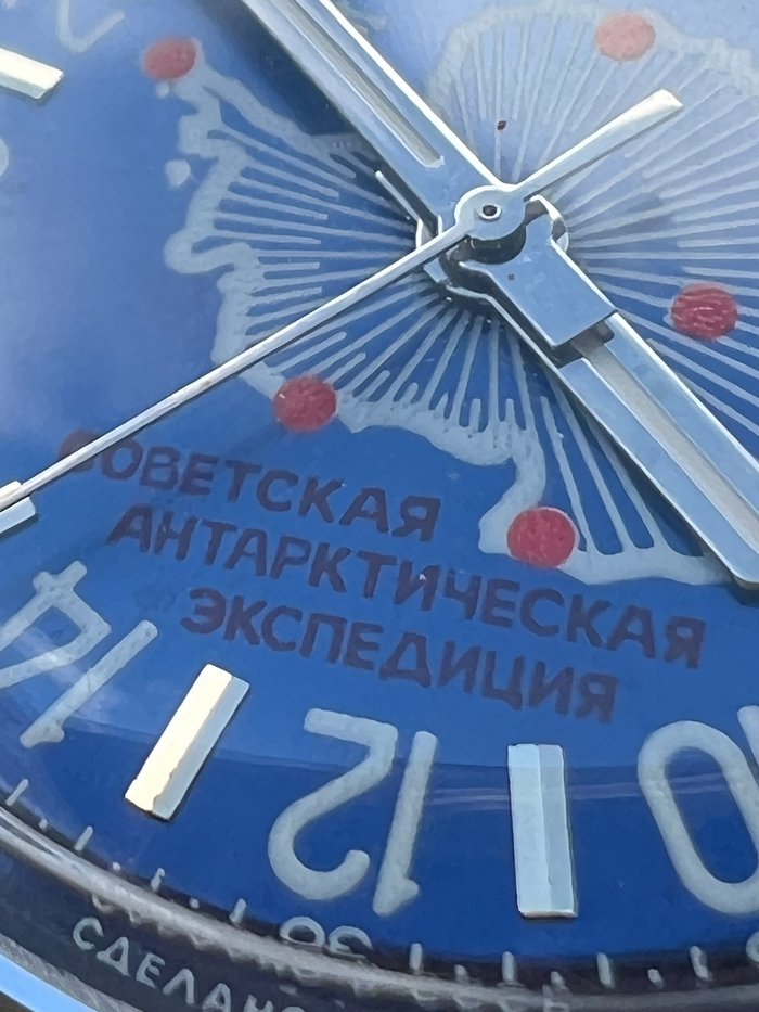 Часы встречают нас синим лучеванным циферблатом с изображением материка и 7 точек высадки экспедиции. На месте точки Южного полюса (в центре циферблата) располагаются 3 стрелки. Хромированные метки чередуются с белыми крупными цифрами, их кстати в сумме 24, а это значит, что часы проходят полный круг за 1 сутки. Чуть выше по радиусу идут мелкие насечки с минутными указателями. Под материком надпись - обозначение экспедиции, а внизу знак качества: "Сделано в СССР"