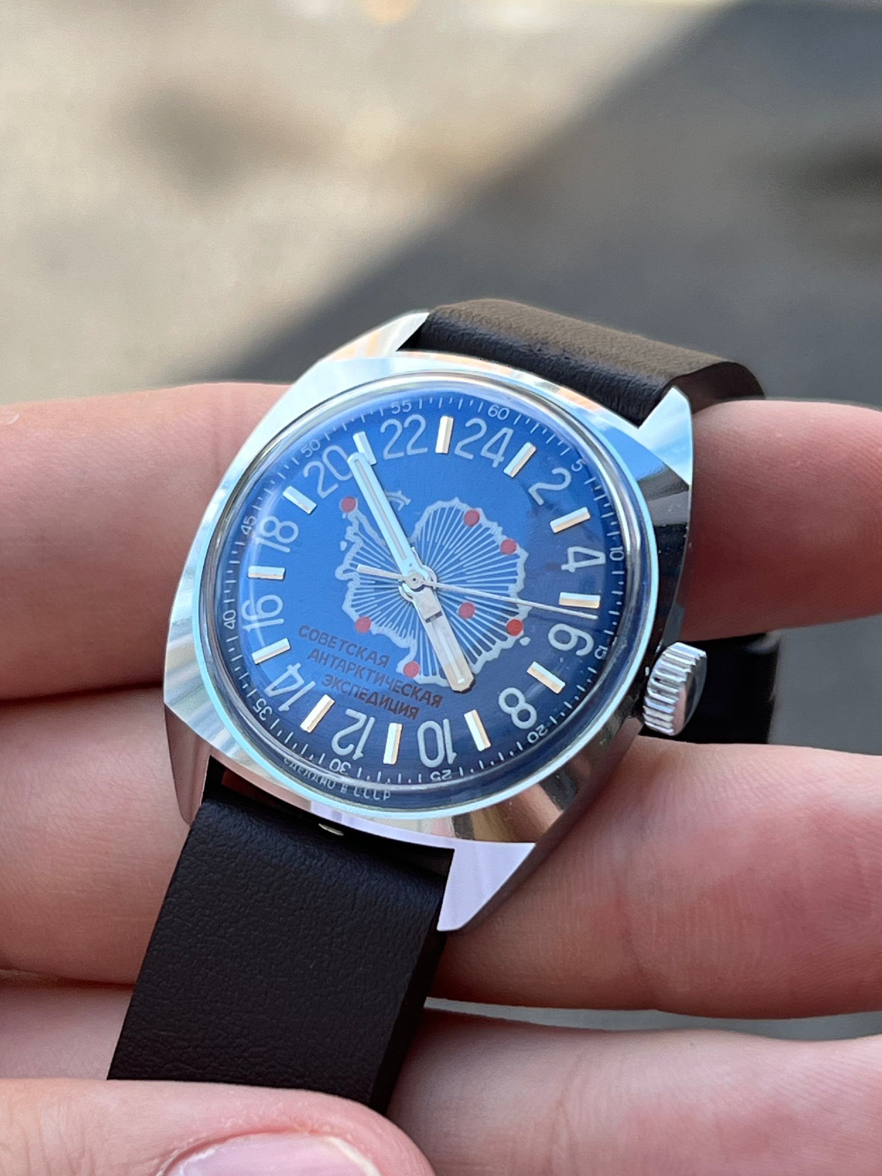 Антарктическая экспедиция— одно из важнейших научных и географических событий в Советском союзе, оно нашло отражение и в часовом мире. Было выпущено несколько вариаций разных полярных часов и это— одна из них. Самая редкая среди всех!