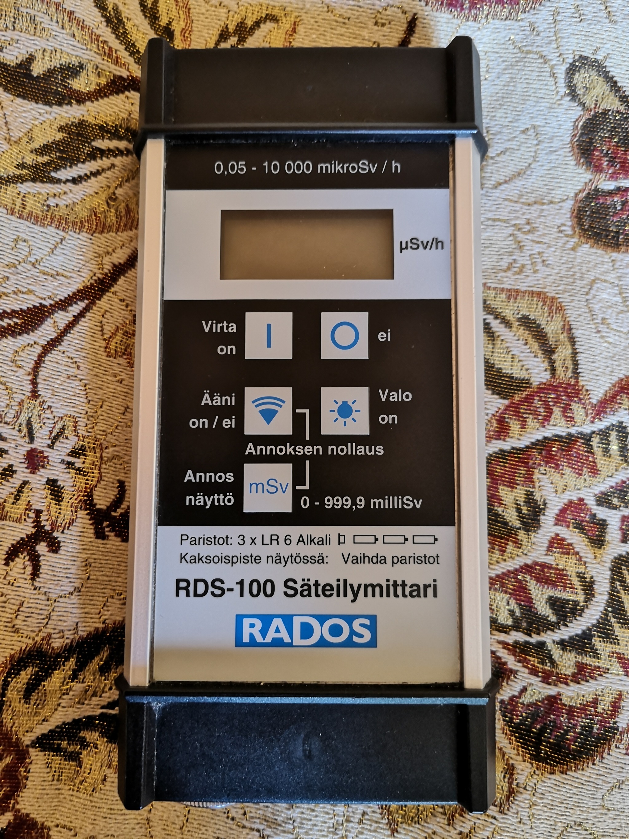 Предел измерения уровня мощности дозы указан чуть выше дисплея (до 10000 мкЗв/ч или же до 1 Р/ч).
