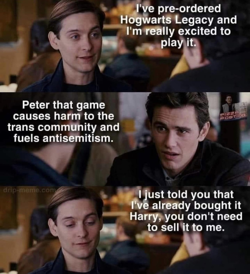 8034 Deathman Будь как дома, Путник Реклама3 3 года назад - Я предзаказал Hogwarts Legacy. Жду не дождусь поиграть в неё.- Питэр, эта игра вредит транс сообществу и подпитывает антисемитизм.- Гарри, я уже сказал что купил её. Не нужно мне дальше её рекламировать Картинка с текстом Игры Человек-паук 116 68 7 Ещё 0