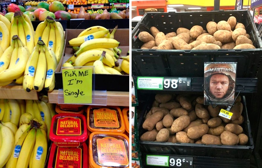 На фото сверху: слева – «Выбери меня. Я один» (возможно, «одинок» или «единственный» – не уверен, что я точно перевожу); справа – мужик тоже чувствовал себя очень одиноко на «красной планете» (фильм «Марсианин», если кто не догадался))). На фото внизу: «Snowman noses» – «Носы (для?) снеговиков»: