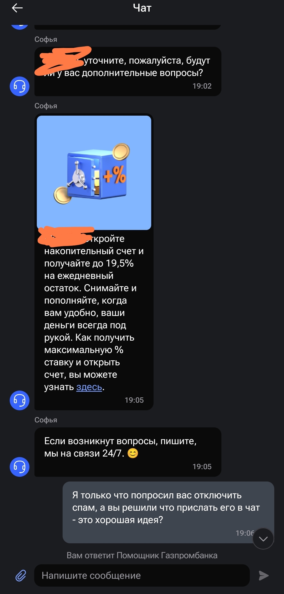 Пишу иим сегодня повторно, повторно создали обращение, пообещали что больше не будут.... И..... В чате, в котором они мне поклялись, что они будут нормальными следующим сообщением прилетает реклама