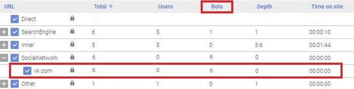Казалось бы, можно предположить, что человек 5 случайно кликнули по рекламе, и тут же закрыли сайт, ну с кем не бывает. Однако, принципиально запускаем оставшиеся 200 рублей на рекламу (всё равно их не вывести из ВК), а до этого подключаем независимый сервис по обнаружению ботов, и получаем: