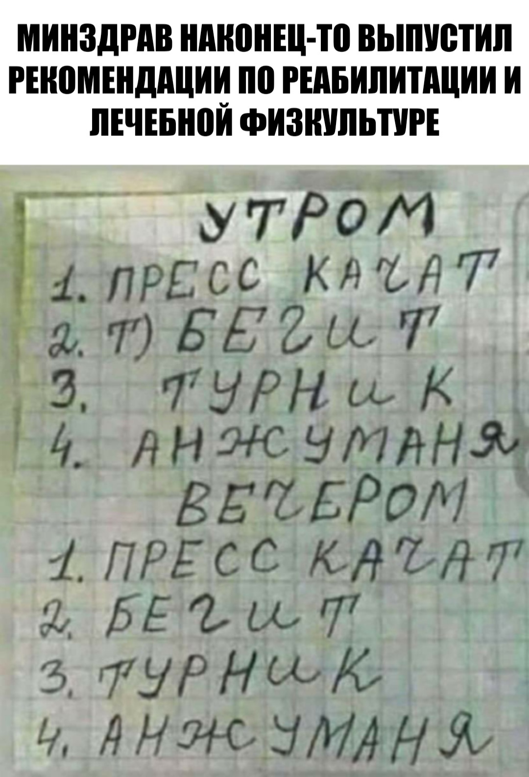 DejurniVrach19 Рекомендации минздрава 1 год назад Медицина Врачи Картинка с текстом Юмор Мемы Рекомендации Реабилитация ЛФК 2 1 Ещё 0