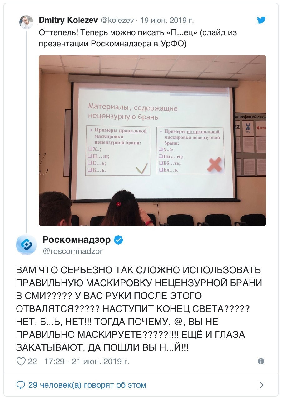 15 cavenaghi 6 лет назад Рекомендует Роскомнадзор https://twitter.com/roscomnadzor/status/1142076989513371648 Роскомнадзор Мат Русский язык