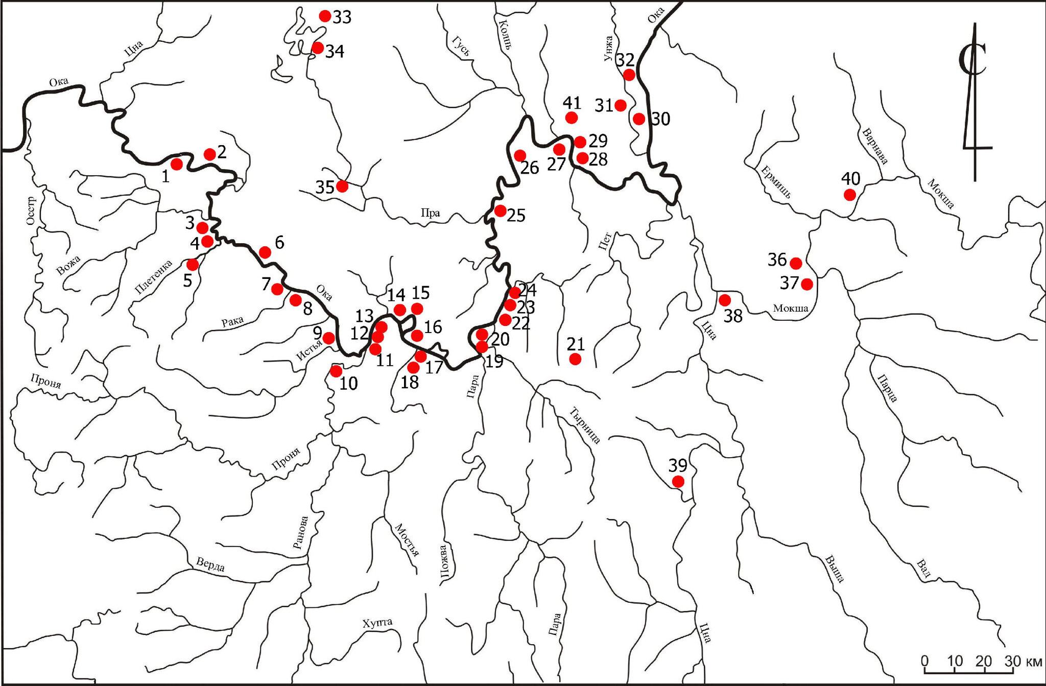 Карта находок КРОМ. Сейчас известно около 40 погребальных памятников рязано-окского типа, в которых изучено более трех тысяч погребений