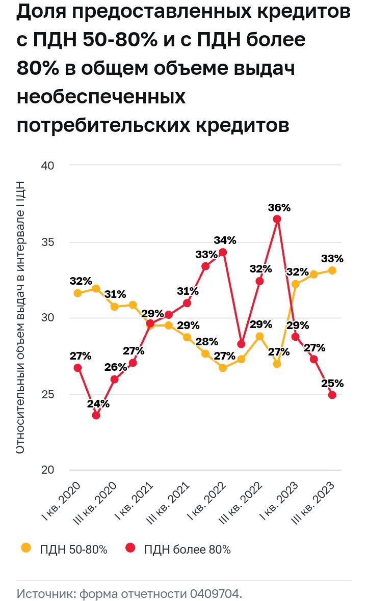 И вот Интерфакс пишет, что прибыль микрофинансовых организаций (МФО) за первые 9 месяцев также выросла на 50% по отношению к прошлому году. И если мы посмотрим на картинку выше, то именно с начала года у нас доля кредитов с ПДН более 80% резко падает. И начинает расти прибыль МФО. Просто люди бегут кредитоваться в МФО под конские проценты. И их долговая нагрузка растет, но статистика ЦБ этого не видит. У них всё в ажуре. Портфель кредитный вырос.