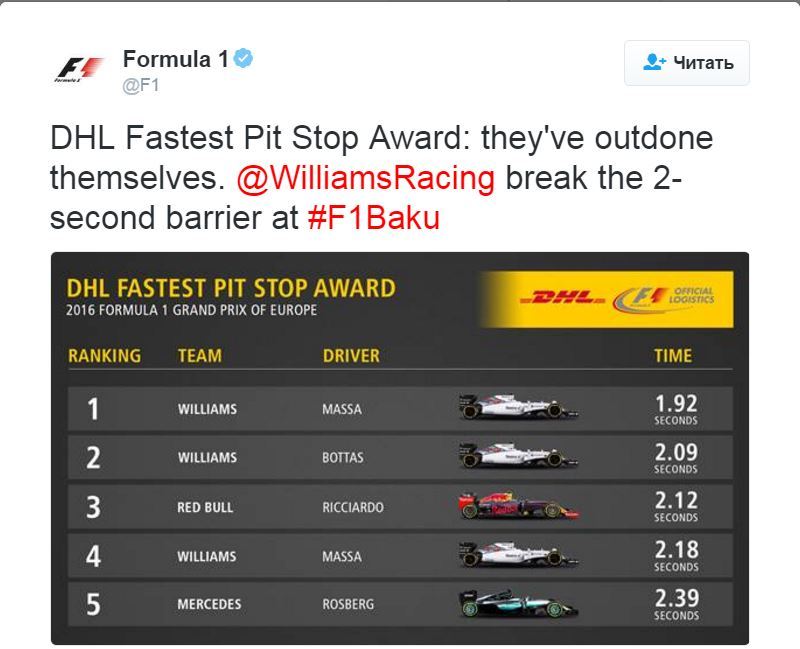 Пит–стоп Фелипе Массы на гран–при Баку стал рекордным — механики Уильямса справились с заменой резины за 1,92 секунды.