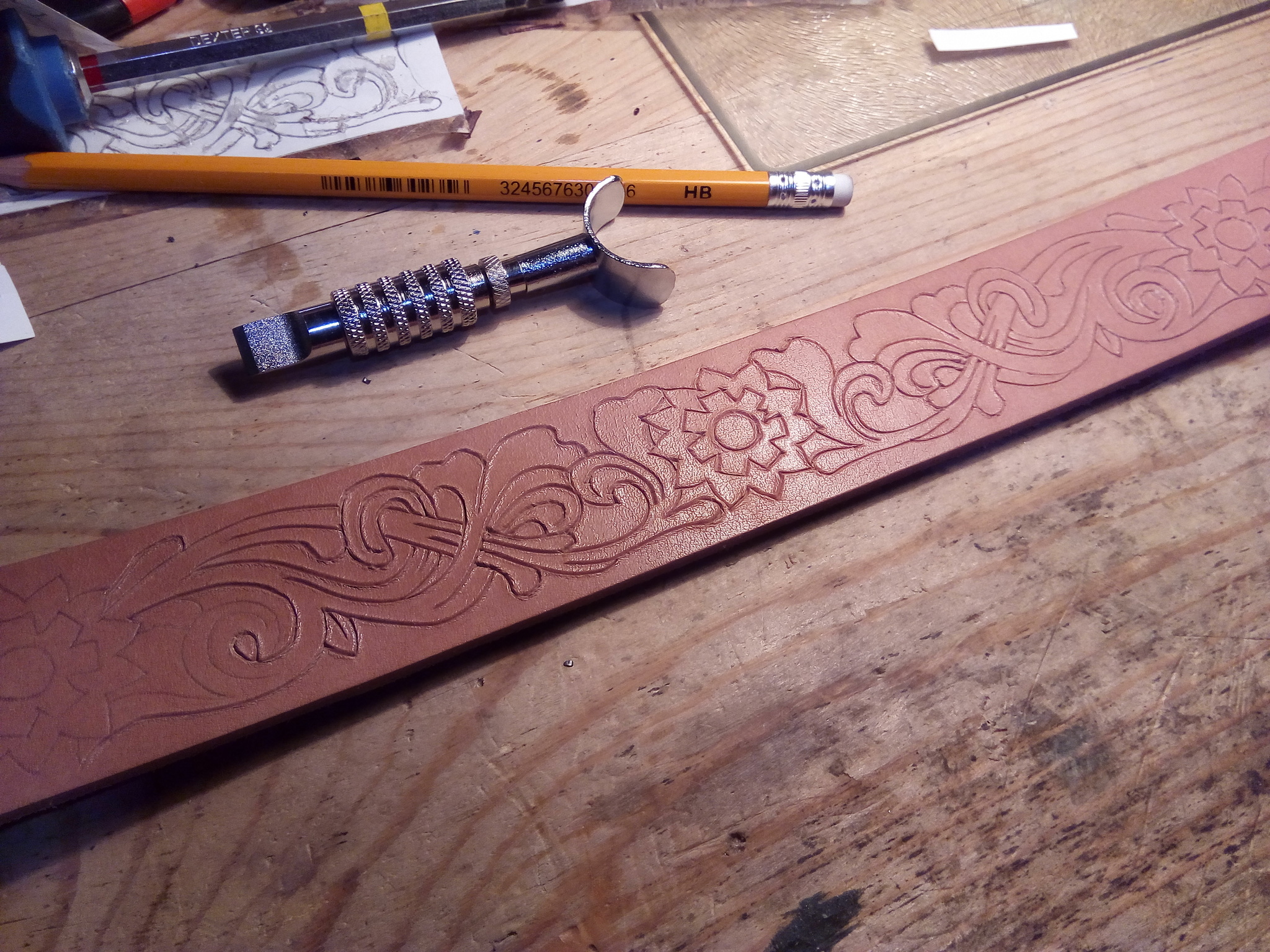 За год лежания у меня ременной заготовки заказал вот такой ножик. И им вырезал узор. Ибо именно таким ножом режут по коже опытные кожевенные мастера. ) А я чем хуже? Ну ладно... ножом с алиэкспресс режут типо опытные мастера...