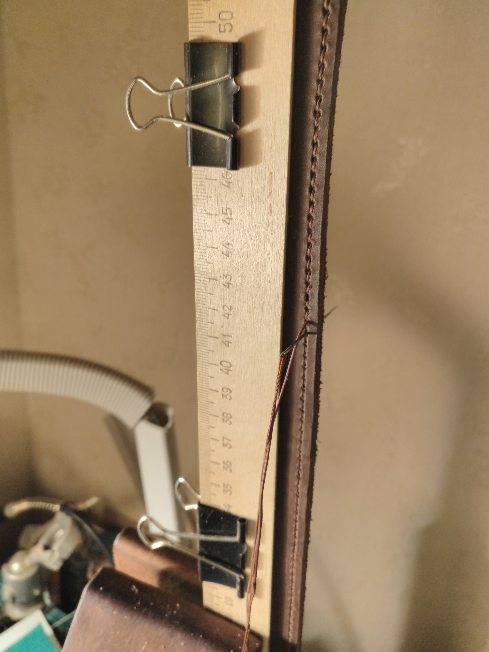 Не так давно кто-то сетовал, мол, все путается и не удобно ремень прошивать. Помогает в этом случае (дабы обойтись без ременного шорника) обычные деревянные линейки прижатые зажимами.