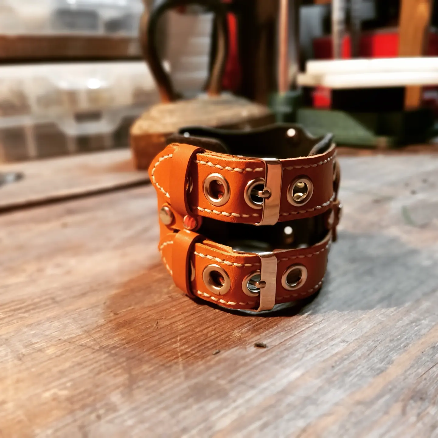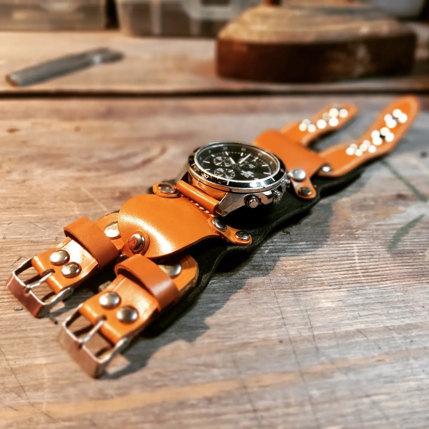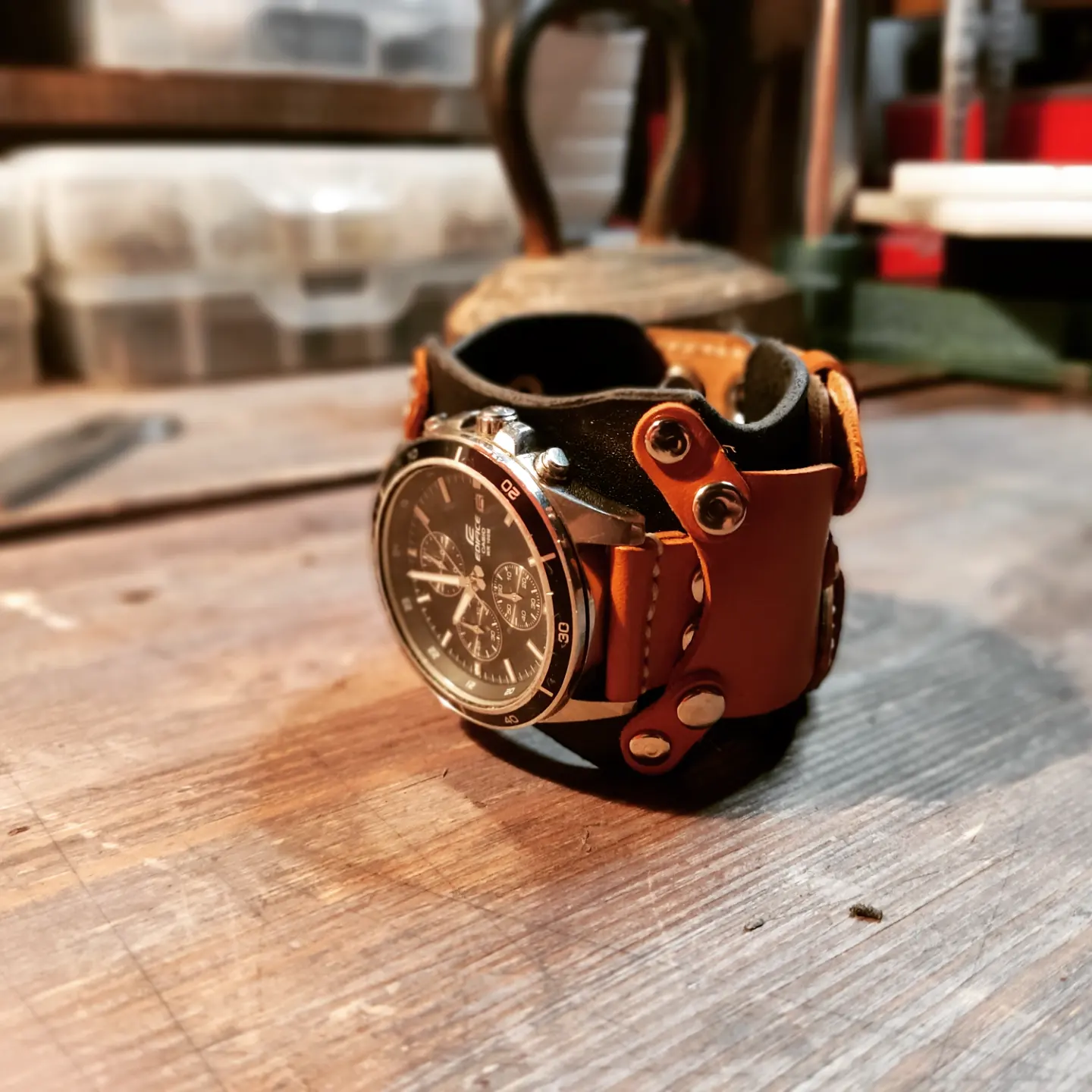 Давно хотелось попробовать ремешок с широким напульсником и двумя пряжками, вдохновился похожей моделью из интернета. Два вида кожи и много даже для меня металлической фурнитуры, но мне нравится. Попробую в будущем ещё несколько подобных моделей.
