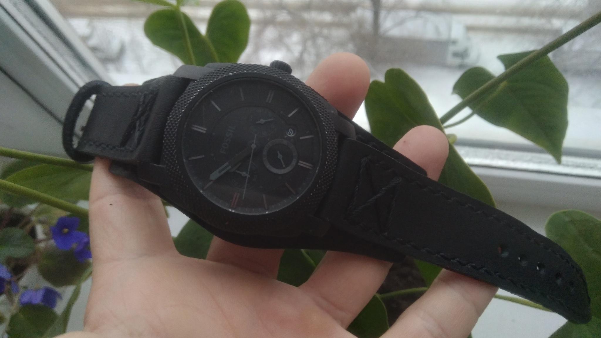 Чёрный ремешок напульсник для часов Fossil с чёрной прошивкой.