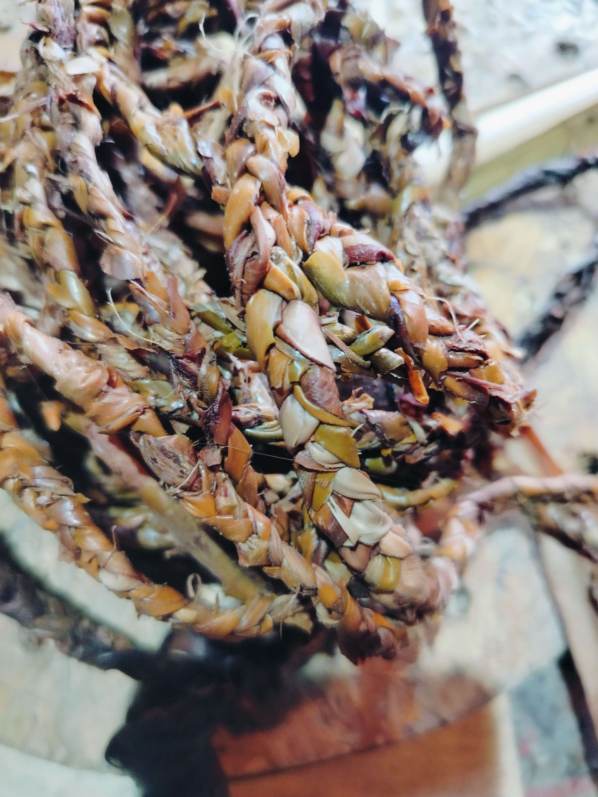 Так как рогоз тонкий и качество, на разрыв, ниже среднего, заплетаем скрученным листом. Длина произвольная. Хвосты оставляем, по мере необходимости можно добавить. Если необходимо, отрезаем нужной длины, концы завязываем.