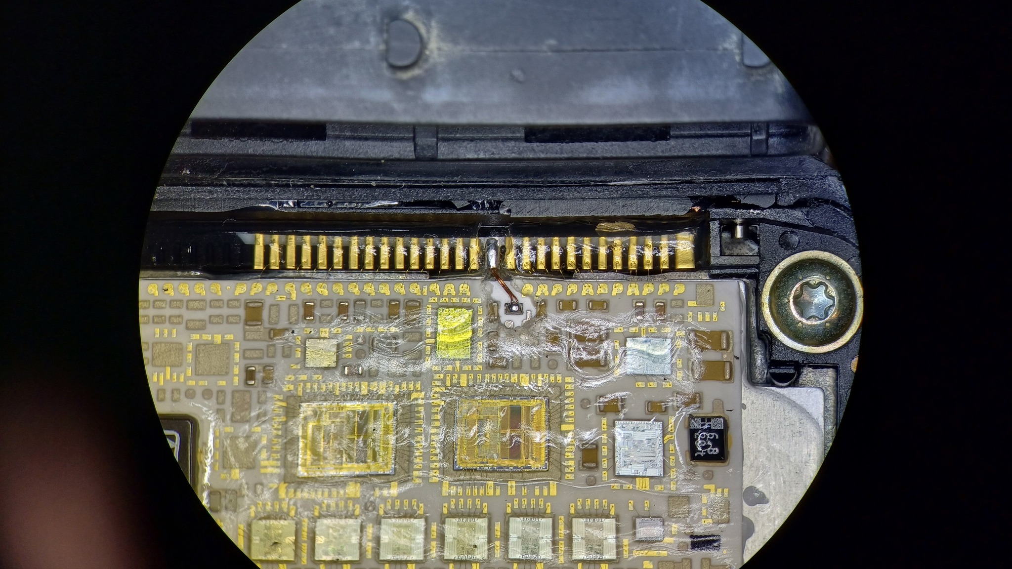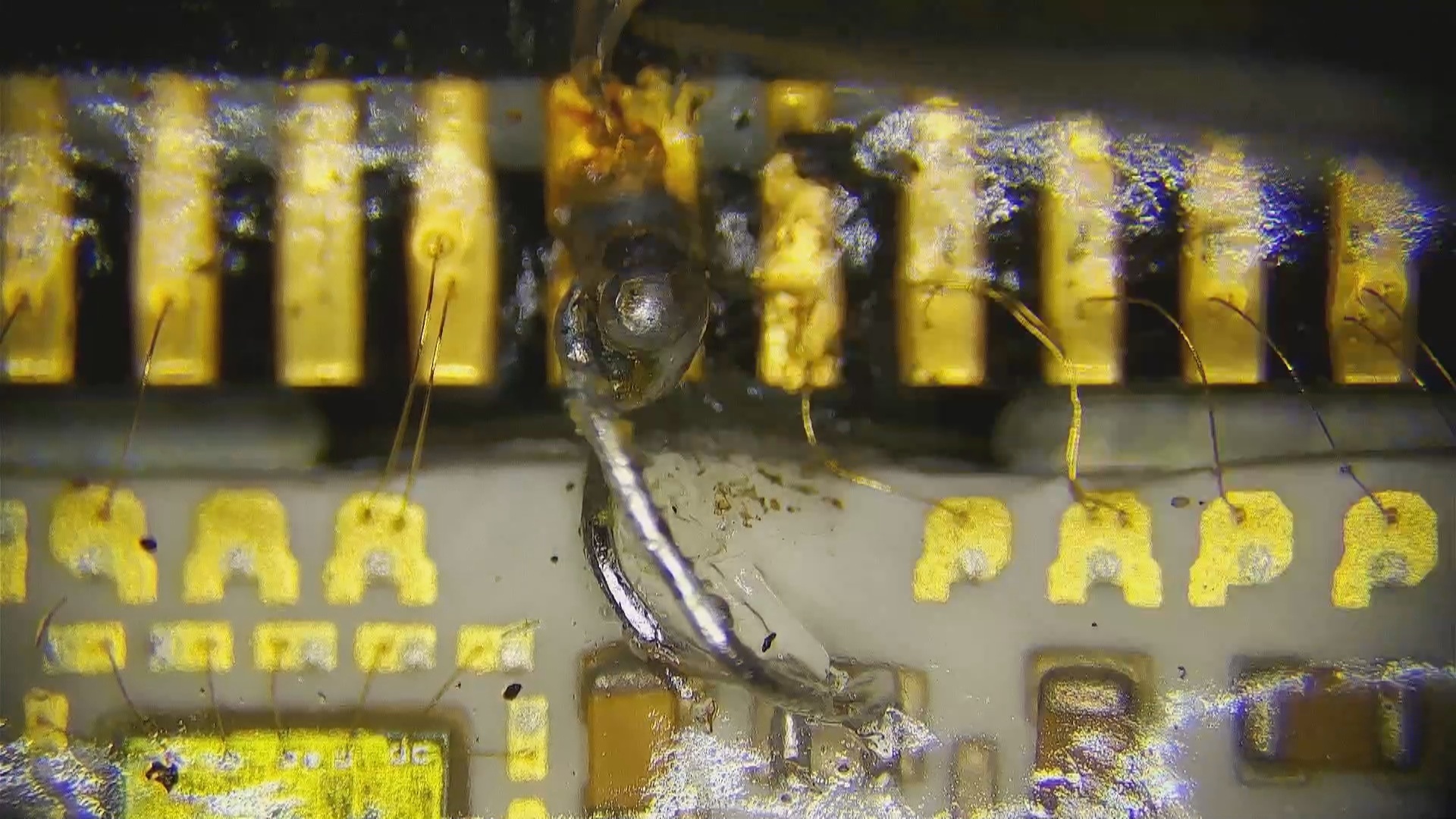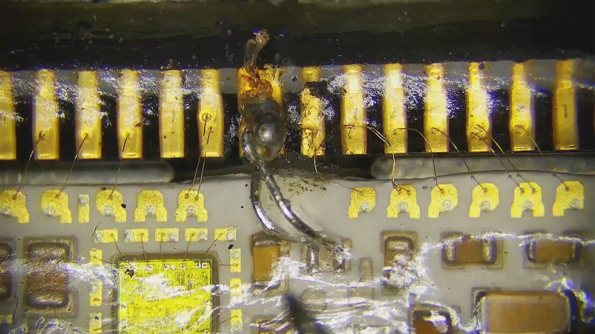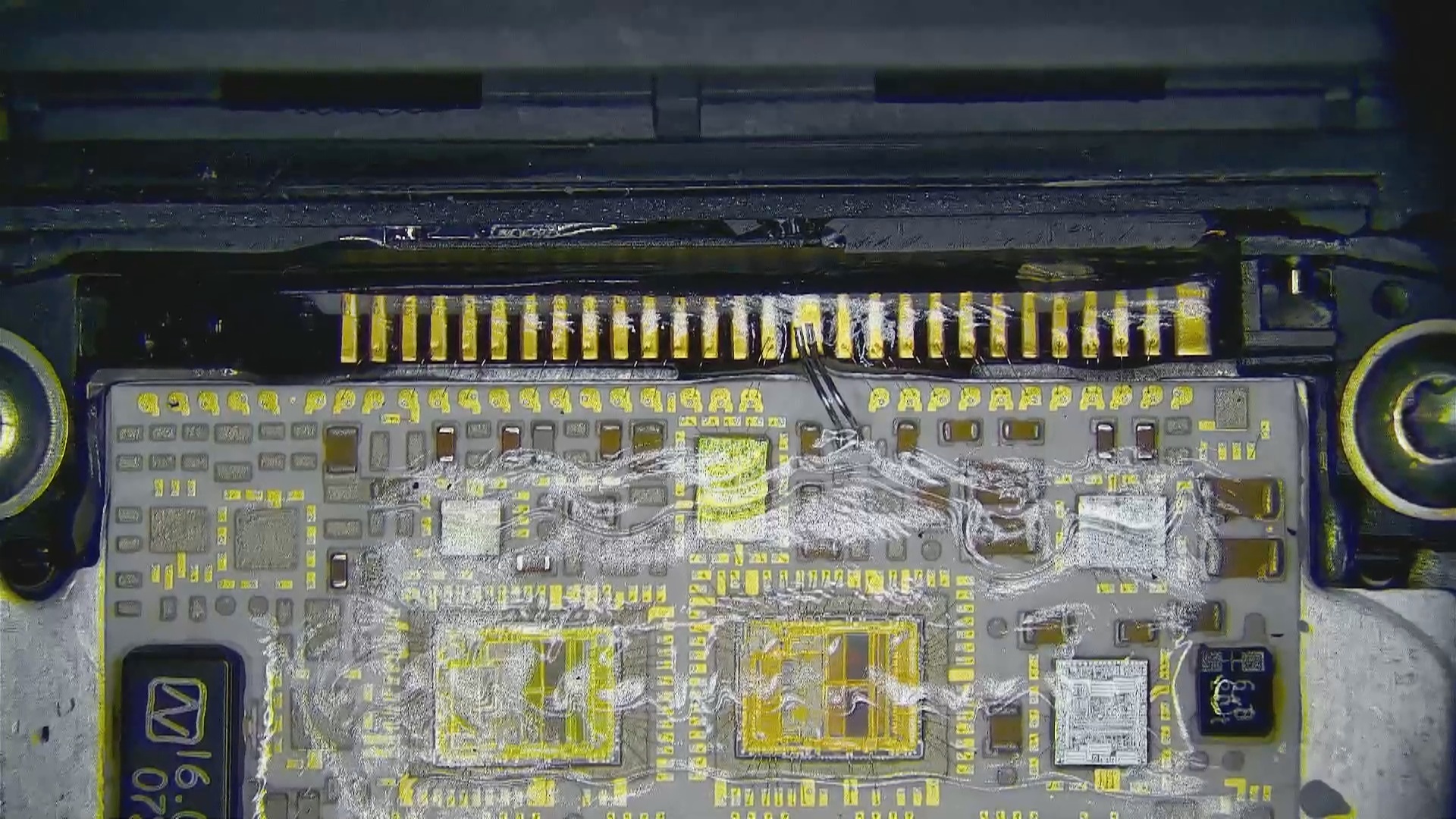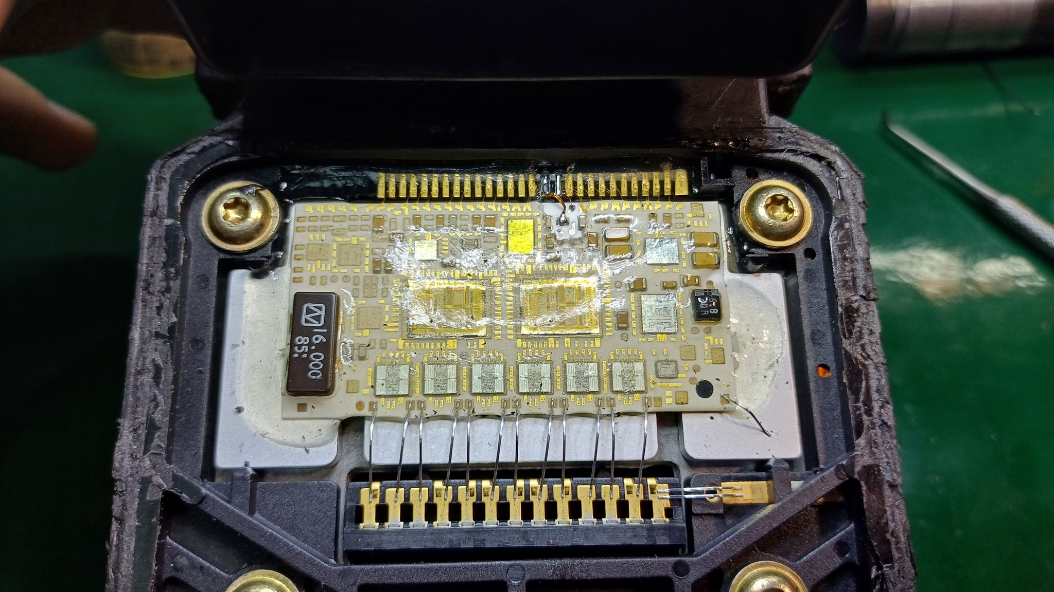 Вся верхняя контактная группа внутри электронного блока выполнена в основном из тонких золотистых проводников. А общий минус, идущий на разъем, реализован двумя алюминиевыми проводниками, которые обычно рассыпаются.