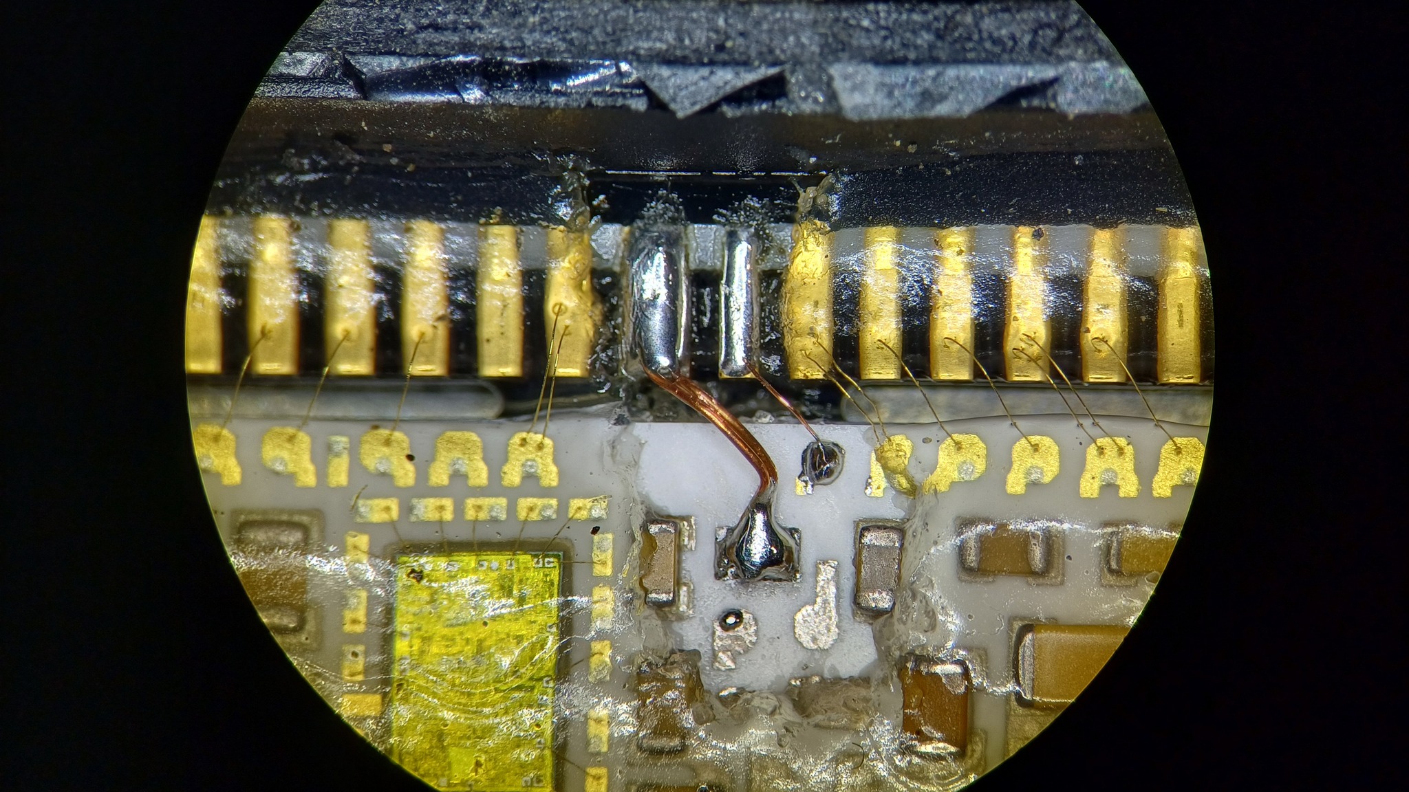 Тонкий золотистый проводник оказался повреждён кислотными испарениями. Решил его тоже заменить