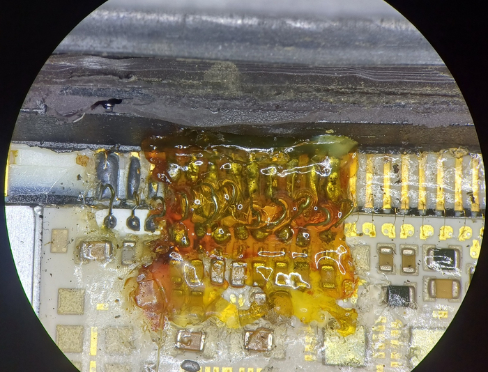 Пришлось страдать. Чистить толстый слой эпоксидки и убирать всё что было под ним напаяно: