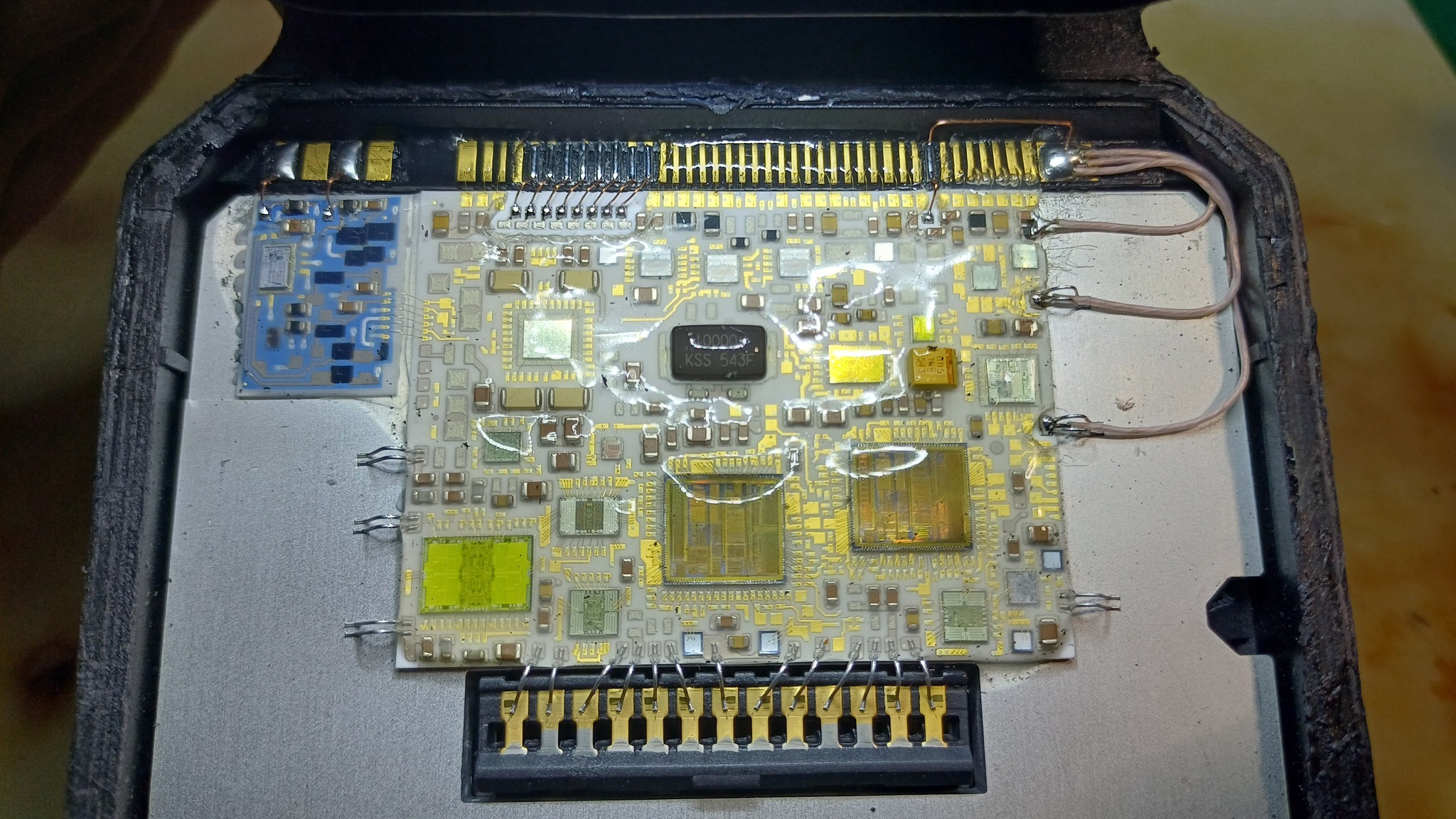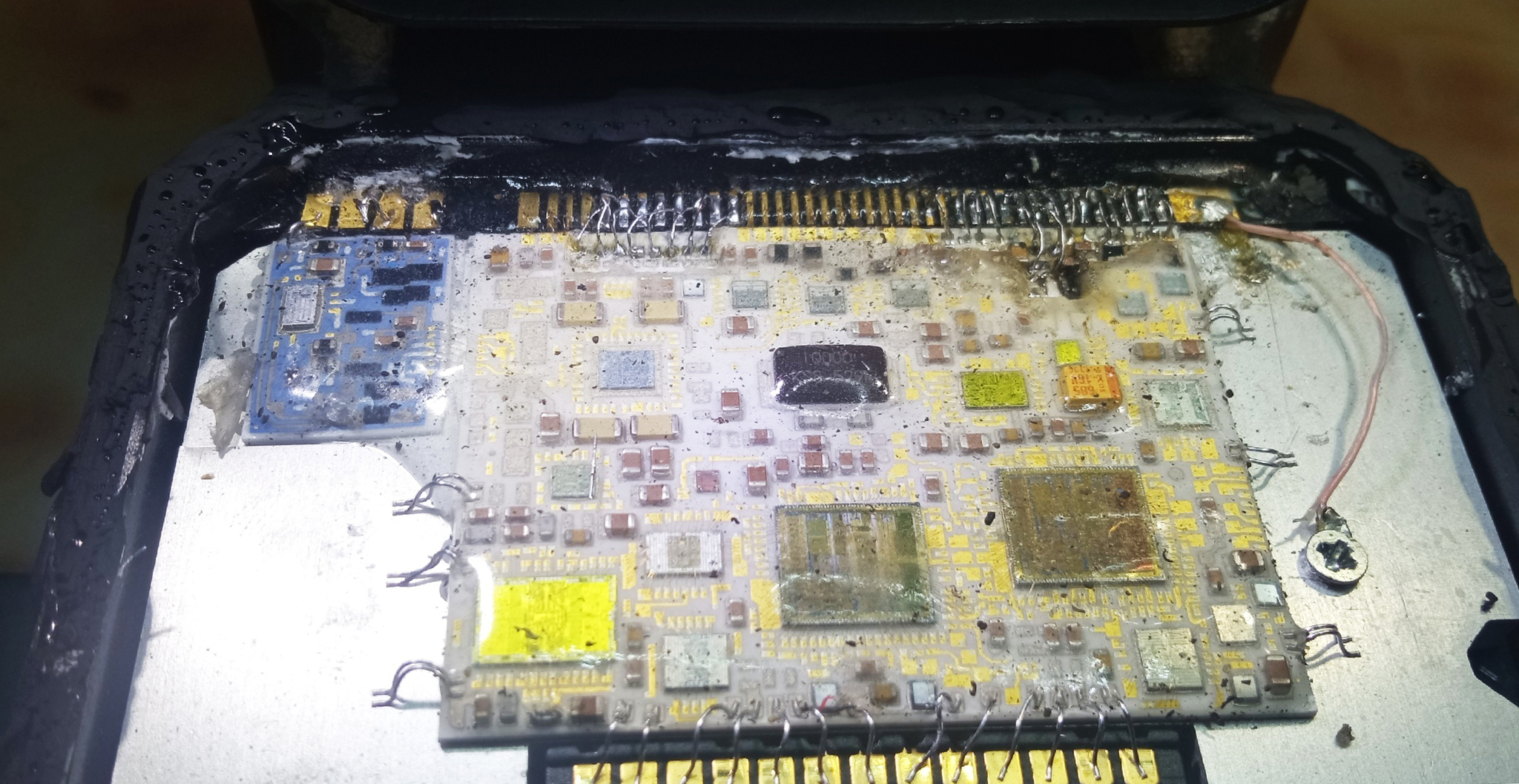 В третьих, плата покрыта гелеобразным силиконовым герметиком. Без опыта его трудно удалить не повредив нежные золотистые проводники. Гель сильно усложняет работы.