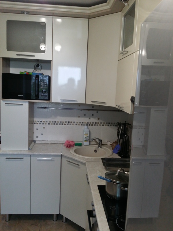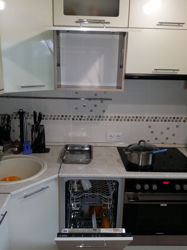 Встраиваемая кухня по моему эскизу обошлась в 51000 рублей ровно со скидками и акциями. Все дверцы с доводчиками, вертикально открывающиеся дверцы с газовыми амортизаторами. Раковина с подводкой шла в комплекте из мраморной крошки. Пришлось купить тройник на слив за 40 рублей, тройник на холодную воду для посудомойки за 340 рублей и смеситель за 2900 рублей + шланги к нему по 120 рублей 2 штуки на 240 рублей. Гофра с отводом еще 320 рублей