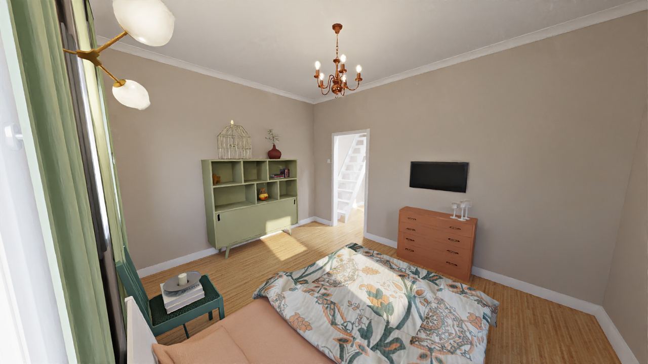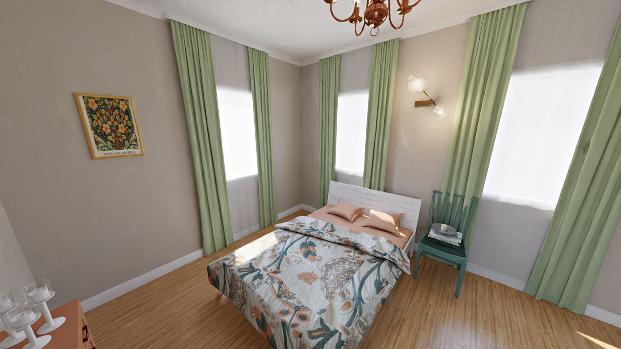 Стены в обоих помещениях — бежево-серые, нейтральные, потолок и плинтуса белые, основной цвет спальни — зеленый, но уже не за счет стен, а за счет текстиля