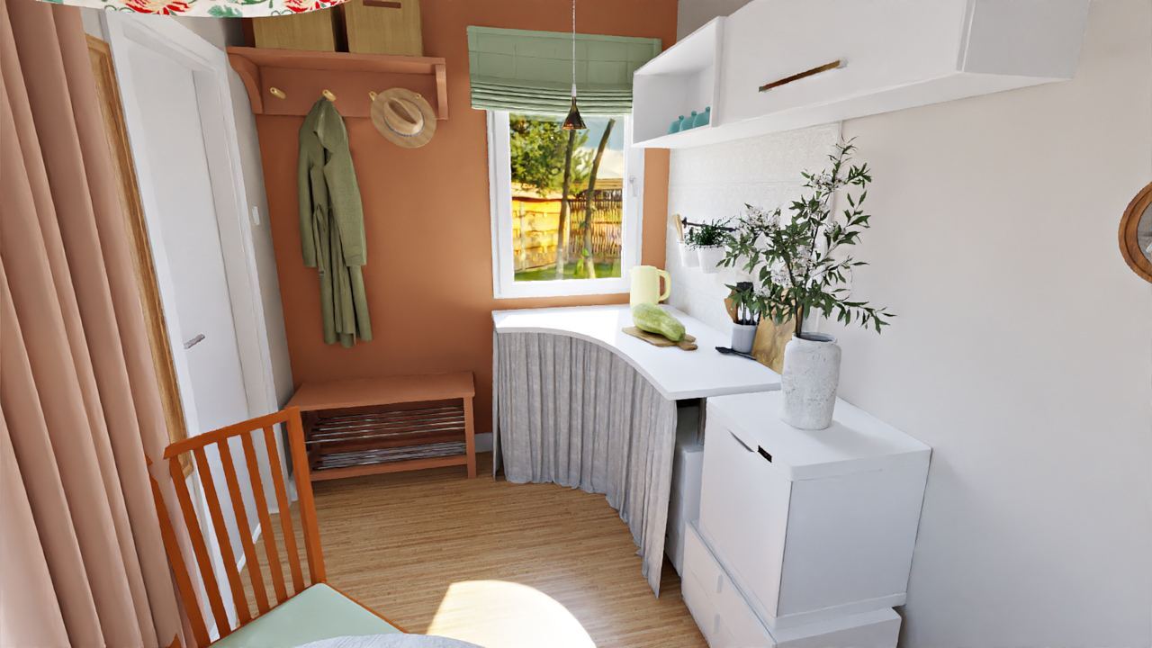 На кухне акцентный цвет — терракотовый, вешалку и обувницу красим в тот же цвет, чтобы визуально их «растворить». Мебель — это столешница старого письменного стола и старые шкафчики, их предстояло покрасить в белый и сшить шторку под стол
