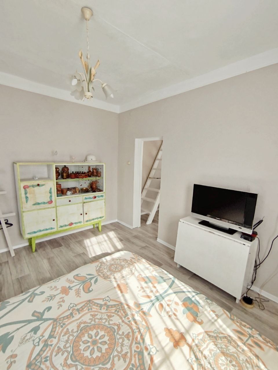 Стало: постелили свежий не самый тонкий линолеум, повесили люстру с Авито, поменяли текстиль ни кровати, сшили новые шторы и тюль