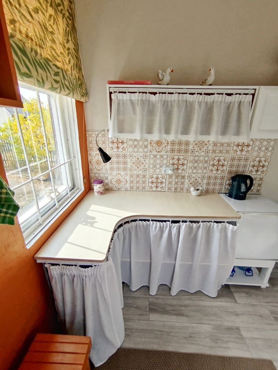 Стало: на фартук положили недорогой кафель по 20 ₽/шт, мебель покрасили, под столом и на полку сшили шторку и повесили на гибкий карниз для штор. Над столом повесили простую лампочку из Икеи — раньше света здесь не было
