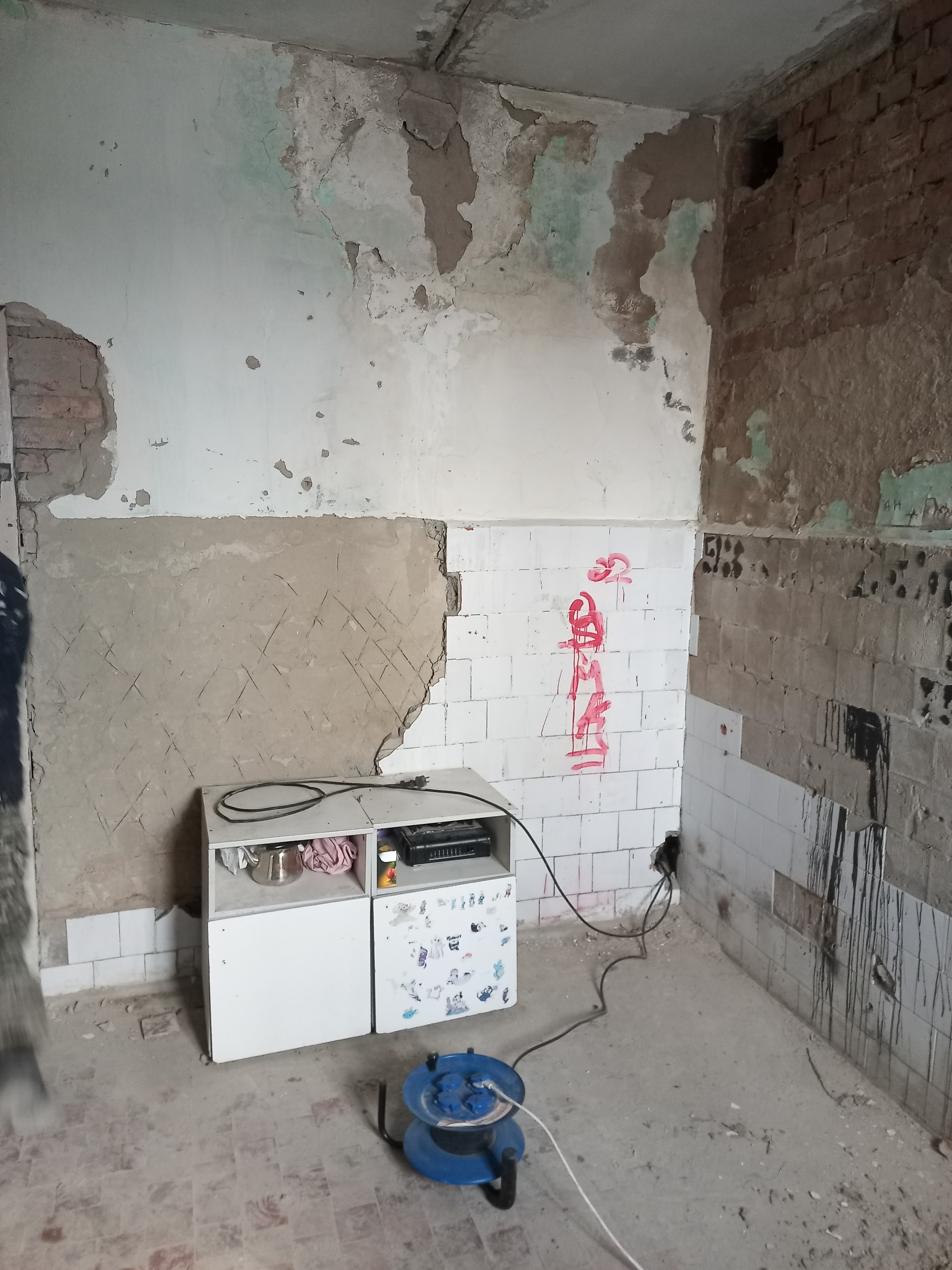 Короче посмотрела и сказала мужу надо хотя бы снять штукатурку. Муж дал мне перфоратор и сказал, ну раз тебе надо снимай. Честно сказать мне раньше не доводилось ничего разрушать, но мне понравилось! Правда до того момента пока я, не дошла до плитки. Под плиткой оказалось 2 бывших дверных проёма, их заложили и сверху замазали цементом. Который нихрена не отрывался. Одну биту я сломала таки. И получилось у нас вот это