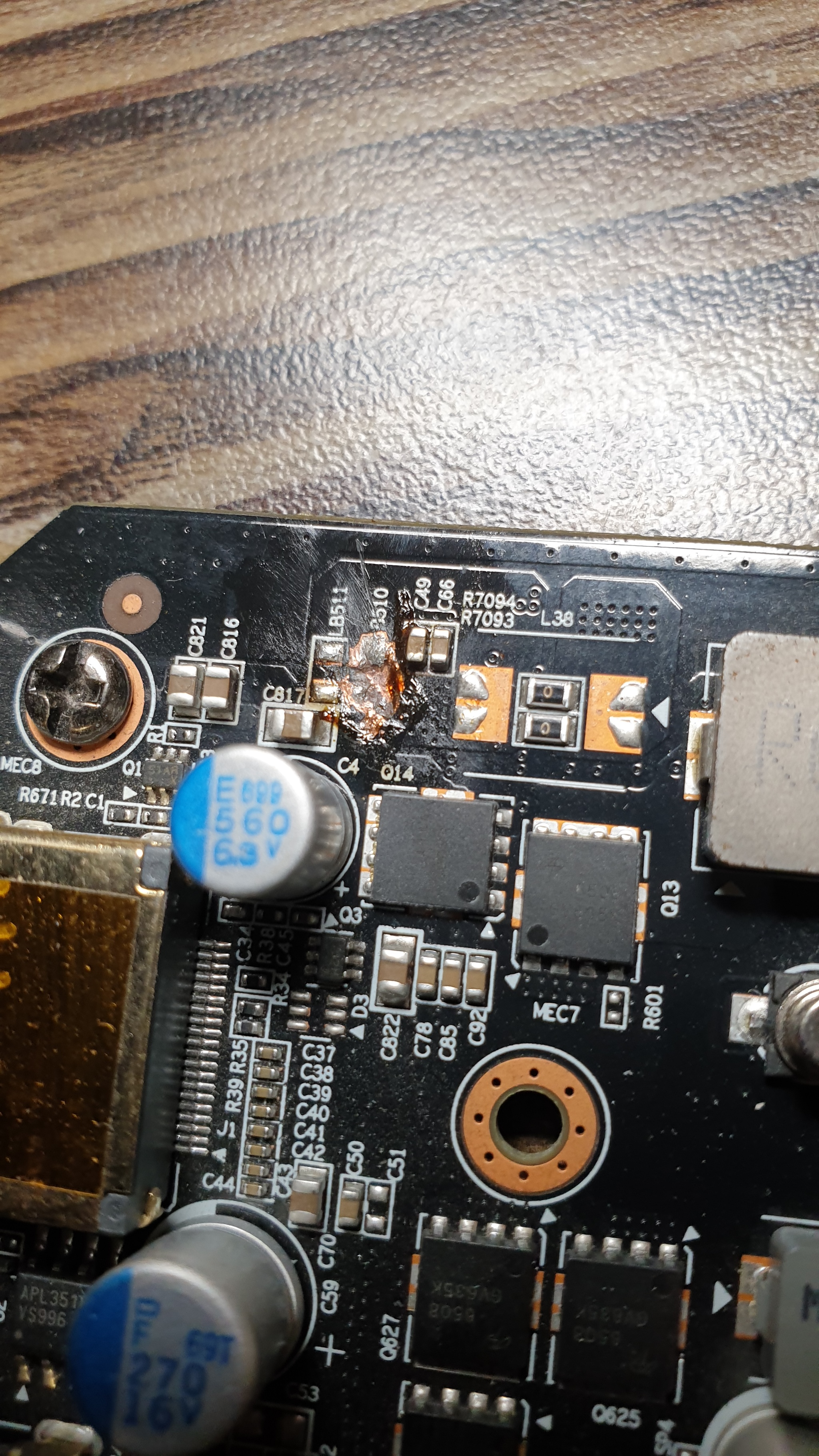 Попала мне в руки карточка Gigabyte GTX1050 2GB (gv-n1050D5-2gd), после чьего-то "ремонта". Диагноз - работает только DVI выход, что категорически меня не устраивает. Беглый осмотр показал только один деффект по толстенным слоем канифоли, см. фото. Подскажите, где можно найти номинал дросселей LB510, LB511? Предохранители рядом целые, так и не понял, был ли там прогар или какой-то умелец от недалекого ума расковырял текстолит. Еще не всю канифоль отмыл, это не прогар.