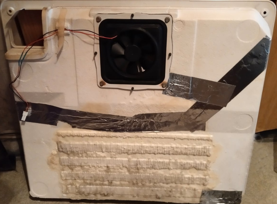 Вид на заднюю стенку морозилки с вентилятором. Сломавшийся пенопласт с прошлого вскрытия, вместо синей изоленты, мастер починил металлизированным скотчем.