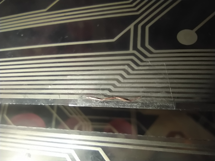 Нужна медная жилка, в моём случае от акустического кабеля, её нужно выровнять и наклеить скотчем на место разрыва.