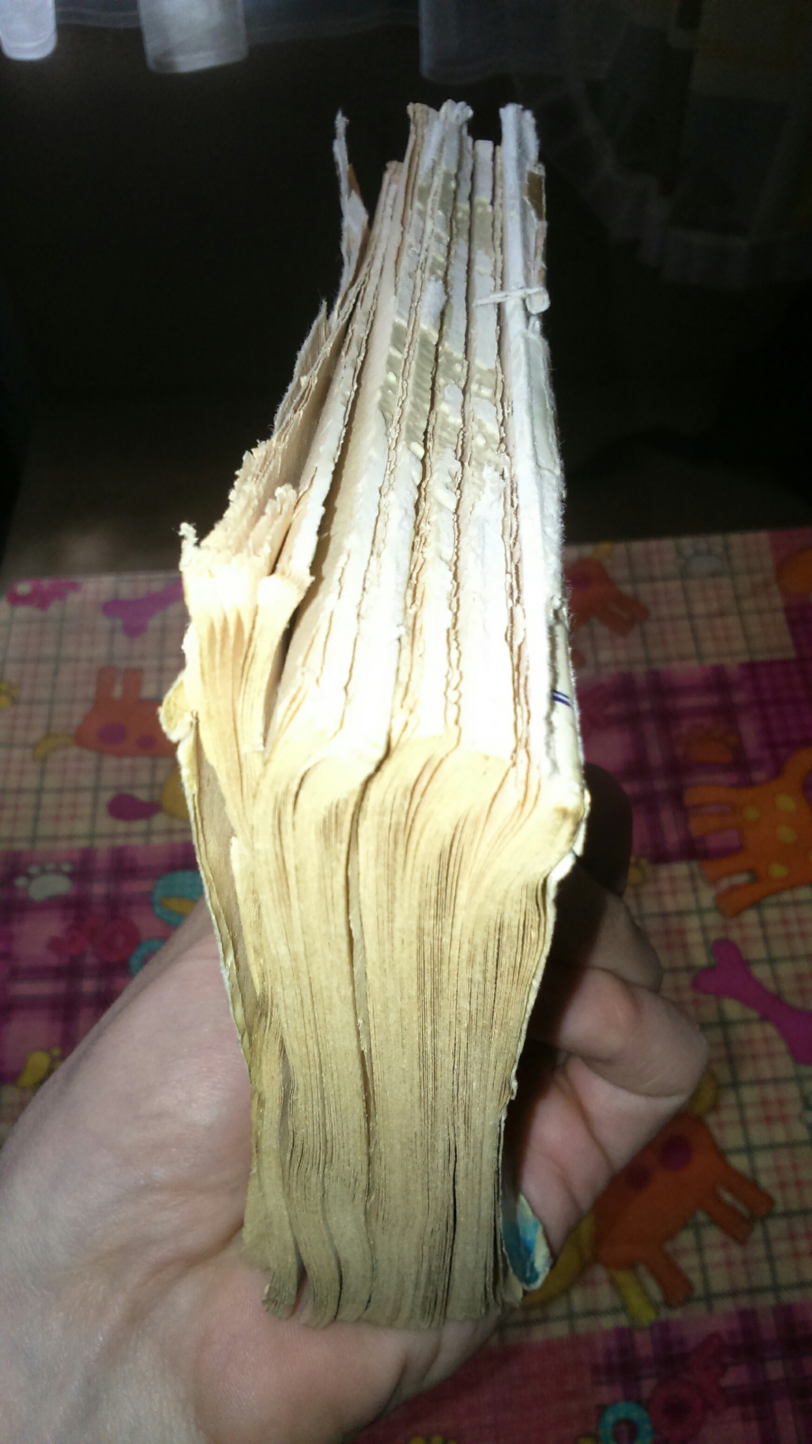 Время его не пощадило, как мы с вами видим. Увы, обложка не подлежит восстановлению даже в виде выклейки на одну из сторонок переплёта. Что ж будет у нас новая обложка из такой вот весёлой ткани, найденной в мамином шкафу. Ну а почему бы и нет?