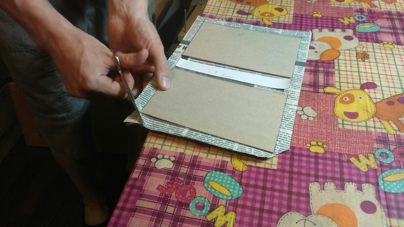 Рекомендую на первые пару часов проложить этот бутерброд полиэтиленовой плёнкой, чтобы ничего не прилипло к доскам пресса. Попутно разбираем старую книжку, сшиваем её и обрабатываем блок как полагается: приклеиваем форзацы, оклеиваем корешок марлей, приклеиваем капталы и полоску плотной бумаги на корешок для его укрепления. Подробно всё описано в этом посте https://pikabu.ru/story/prostoy_remont_staroy_knigi_6763519 Пока наш блок сохнет в прессе, кроим материал на переплётную крышку или обложку, если проще. Режем со стороны ткани, придерживая рукой, в противном случае она будет задираться лезвием.