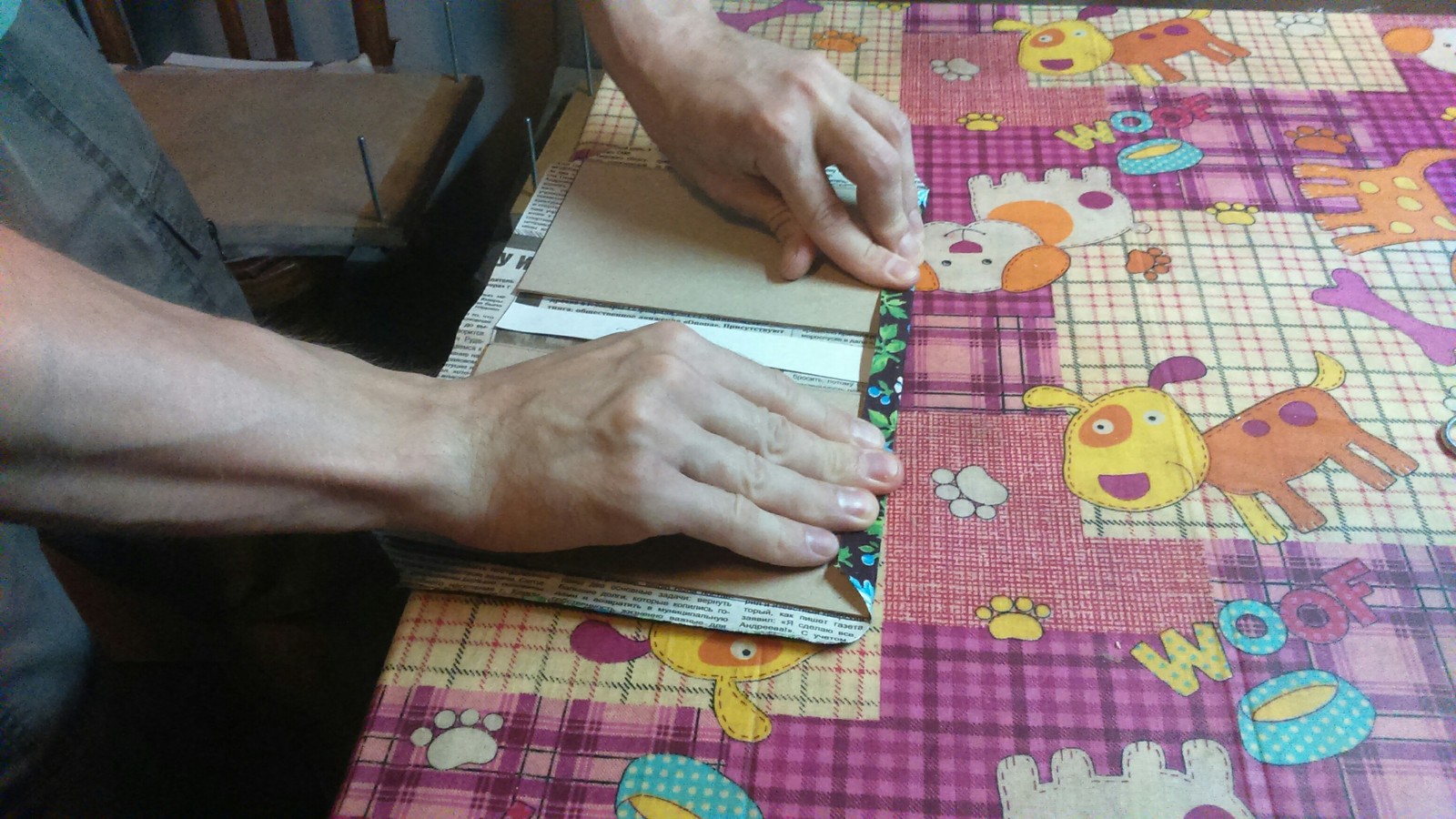 Это необходимо для того, чтобы картон закрылся материалом на углах. И загибаем поле материала, проглаживаем на себя чистой тряпочкой