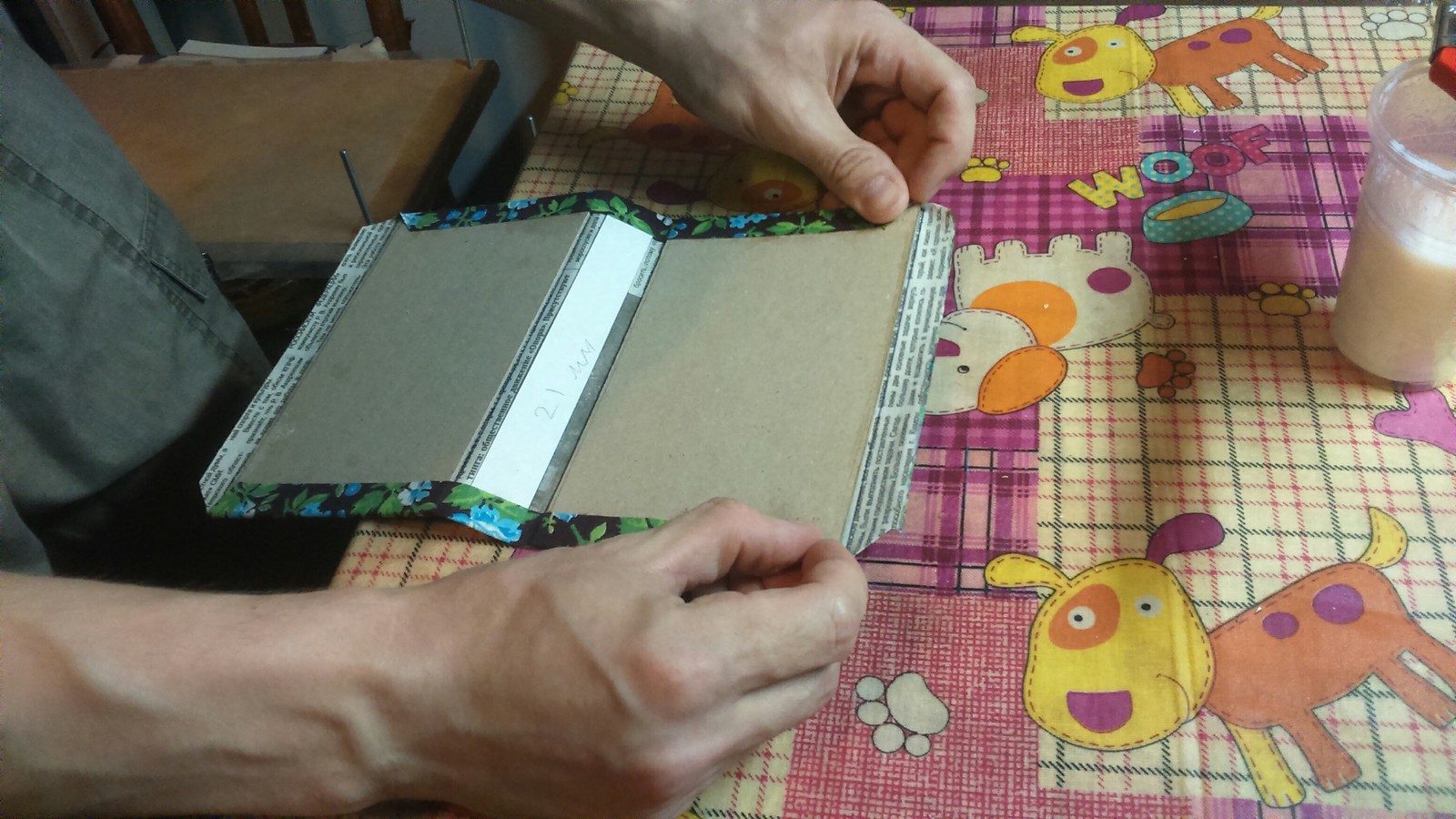 Тщательно приглаживаем чистой тряпочкой. Если клей успел подсохнуть, подмазываем кисточкой сколько нужно. То же самое проделываем с противоположной стороны. Настал черёд углов. Поворачиваем обложку короткой стороной вверх. Кончиками ногтей прижимаем уголки к кромке картона вот так