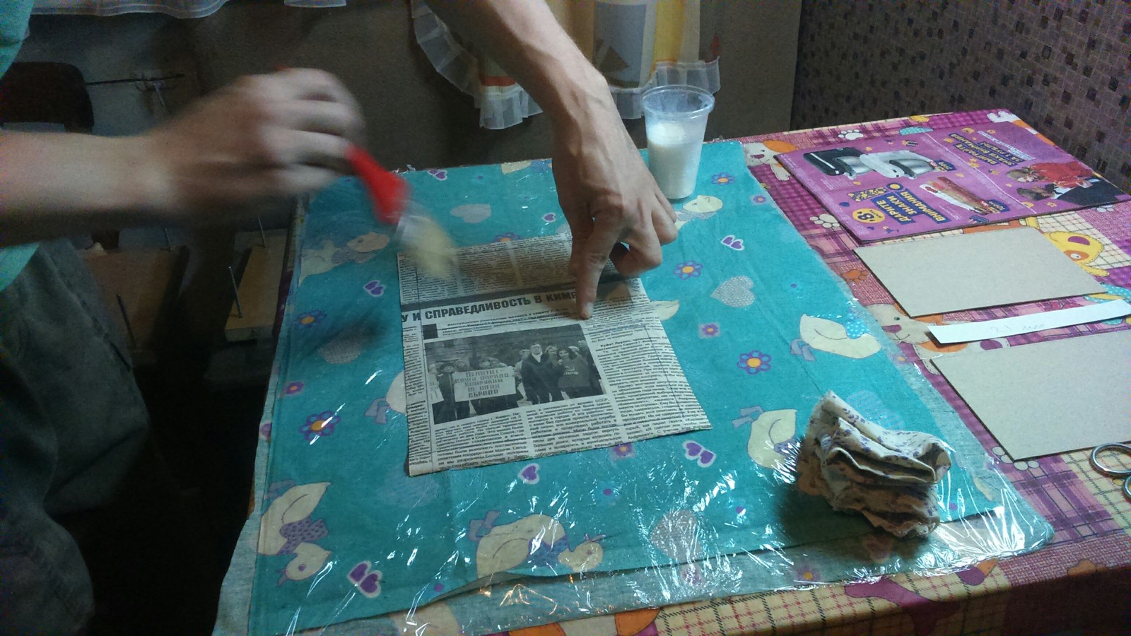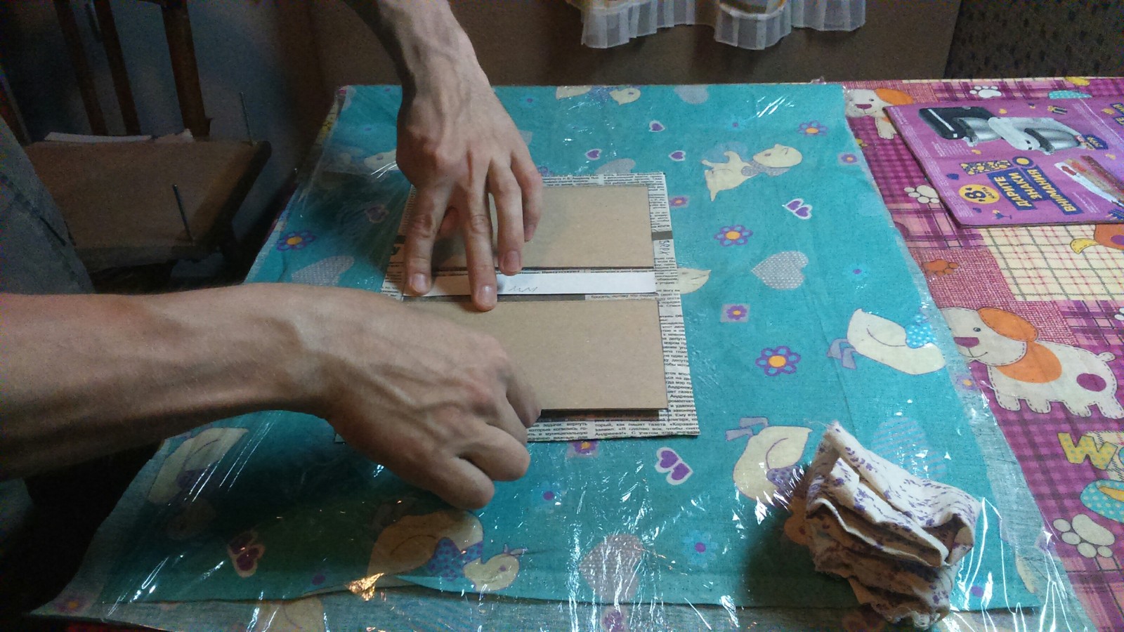 Расчёты сделаны, начинаем изготовление нашей обложки. Предварительно размечаем материал с изнанки по образцу на фотографии выше. Промазываем слегка разбавленным водой клеем ПВА. Промазываем от середины к краям равномерным слоем, не пропуская ничего. Стол можно застелить пищевой пленкой