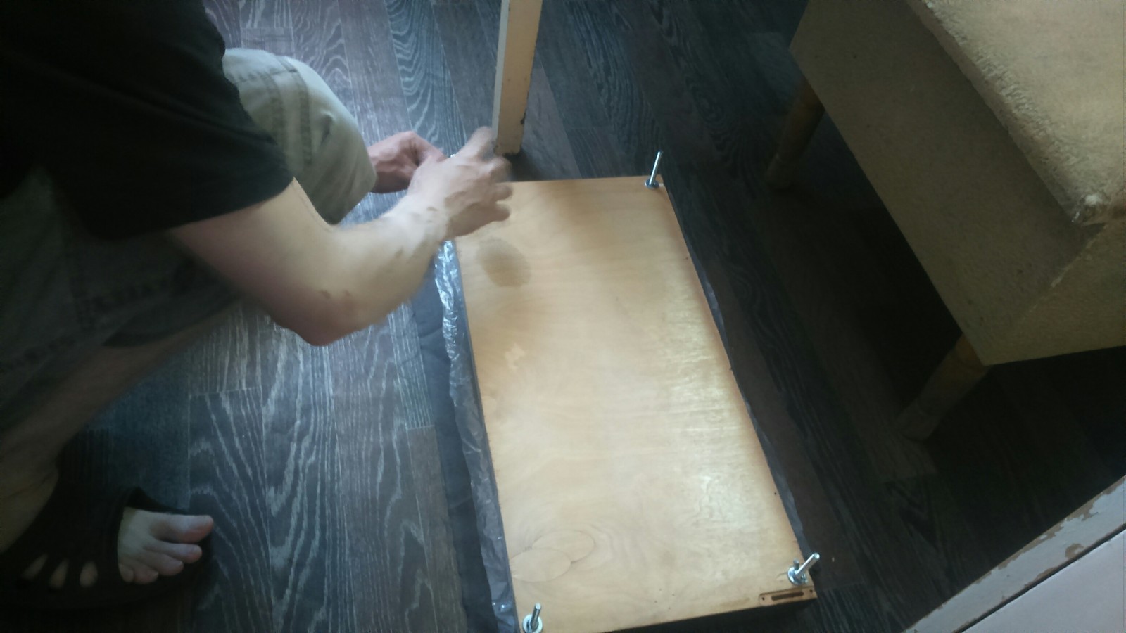 Начинаем загибку с верхней длинной стороны. Пальцы подсовываем под материал сверху заготовки, как бы проглаживая кромку сторонки, загибаем край материала на себя, слегка натягивая, чтобы не было пустых кантов. Не перестарайтесь, иначе сторонка сдвинется по свежему клею, придерживайте её большими пальцами