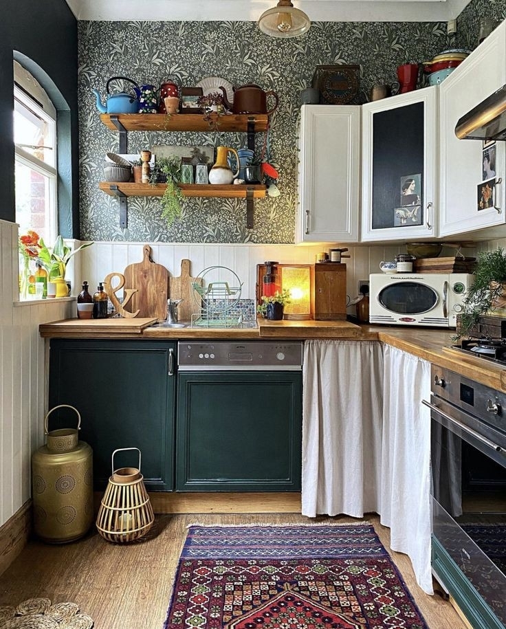 Фотографий как я это всё отделывала и декорировала не сохранилось. На пол положила линолиум на подложку. Стены просто сделала под венецианскую штукатурку, используя доступные материалы. Фартук из микро цемента под камень, покрыт эпоксидной смолой. Мебель купила недавно, собрала сама. Мебель из натуральной сосны декорирую маслом и лаком сама. Дизайн мой, своеобразный, под фармхаус. Коллекция тарелок и кружек нашла своё место. В планах сделать откосы декоративной штукатуркой и положить на подоконник стеклянную мозаику.