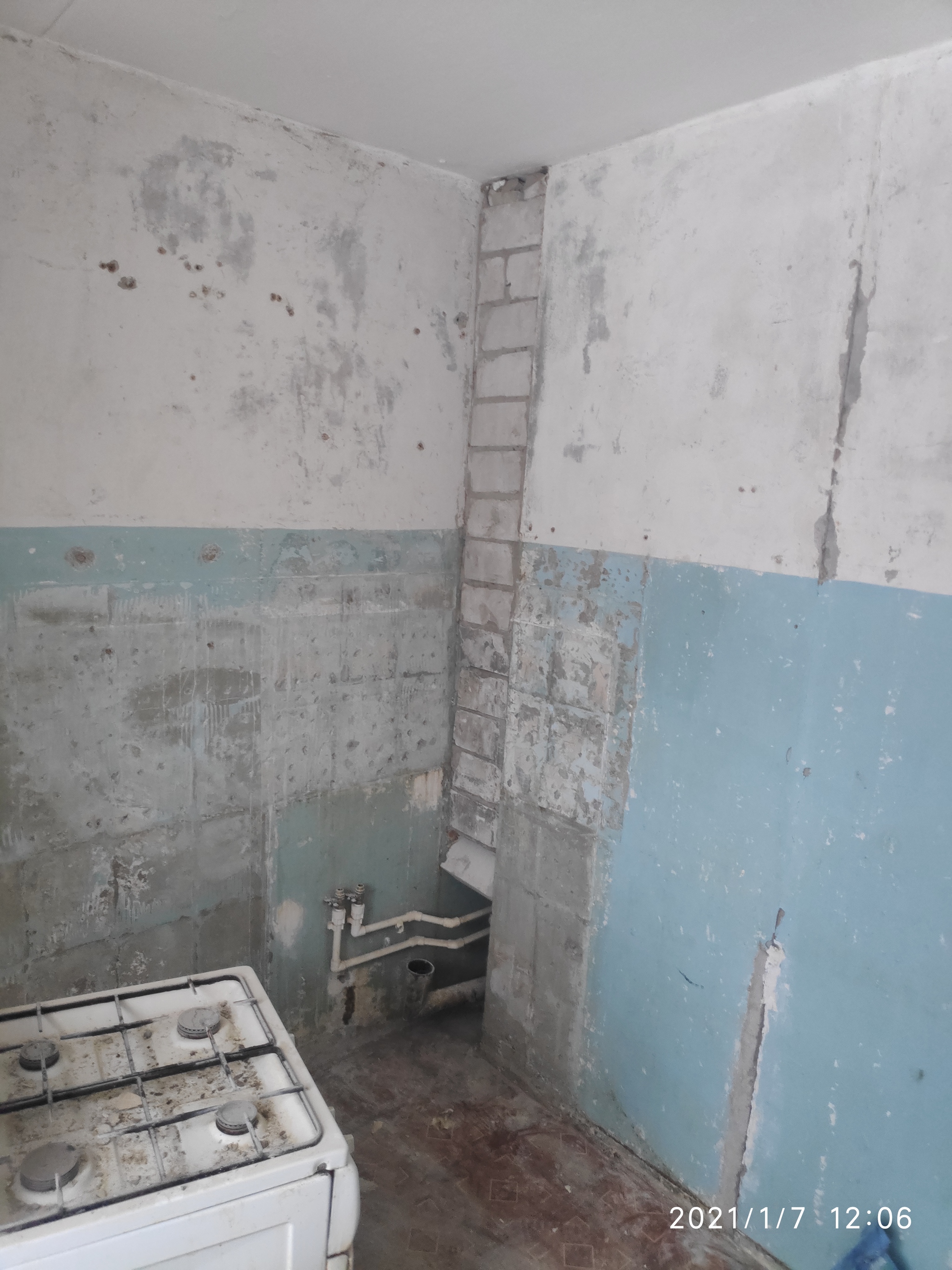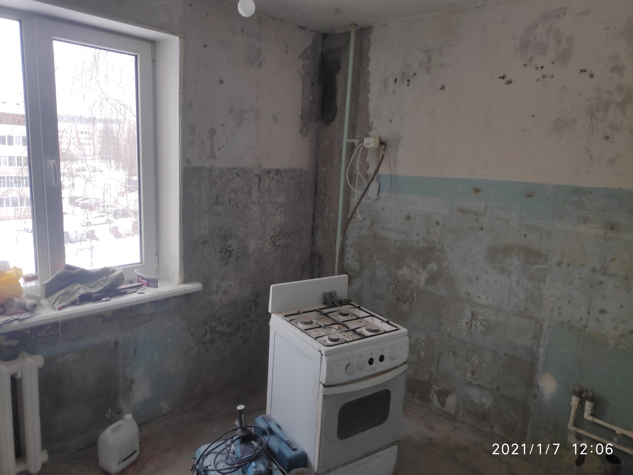 Но коридор с кладовкой, это ерунда. Т.к. стены и полы я решил выравнивать, необходимо было подготовить стены к штукатурке. Кухня, вроде как, относится к влажным помещениям, поэтому штукатурку я выбрал на цементной основе. Как положено перед оштукатуриванием стен, с них была удалена старая краска. Процесс омерзительнейший. Побелку с верхней части стены счищал с помощью УШМ со щёткой, предварительно обильно смочив водой стену. Краску внизу, долбил перфоратором. На самом деле я перепробовал все способы кроме цепей, перфоратор с широким зубилом в моем случае вышел в топ.