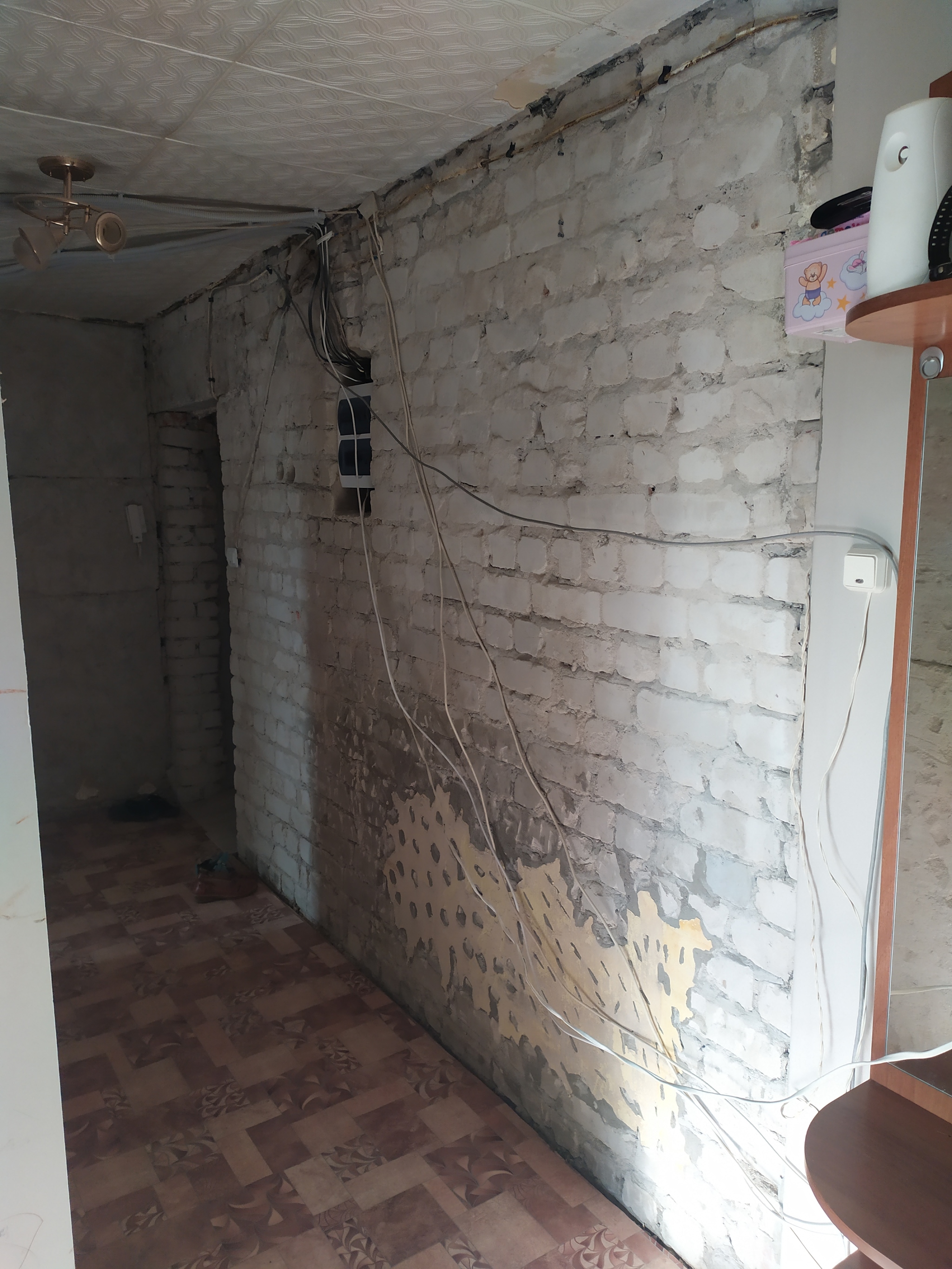 Но коридор с кладовкой, это ерунда. Т.к. стены и полы я решил выравнивать, необходимо было подготовить стены к штукатурке. Кухня, вроде как, относится к влажным помещениям, поэтому штукатурку я выбрал на цементной основе. Как положено перед оштукатуриванием стен, с них была удалена старая краска. Процесс омерзительнейший. Побелку с верхней части стены счищал с помощью УШМ со щёткой, предварительно обильно смочив водой стену. Краску внизу, долбил перфоратором. На самом деле я перепробовал все способы кроме цепей, перфоратор с широким зубилом в моем случае вышел в топ.