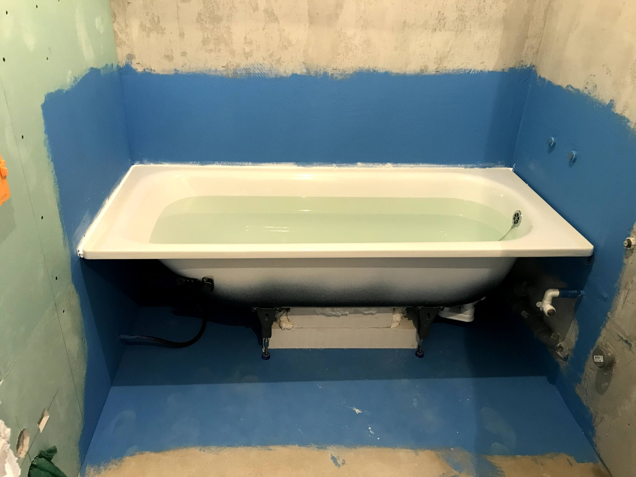 Следующим этапом доделал гидроизоляцию на полу (до этого не делал, чтобы не убить её хождением в обуви и грязью) и стал укладывать керамогранит на пол с/у с выходом (не прерываясь) в прихожую. Первый ряд от пола керамогранита на экране ванной и белой плитки на стенах делал после пола, тк ставил на него с небольшой подрезкой.